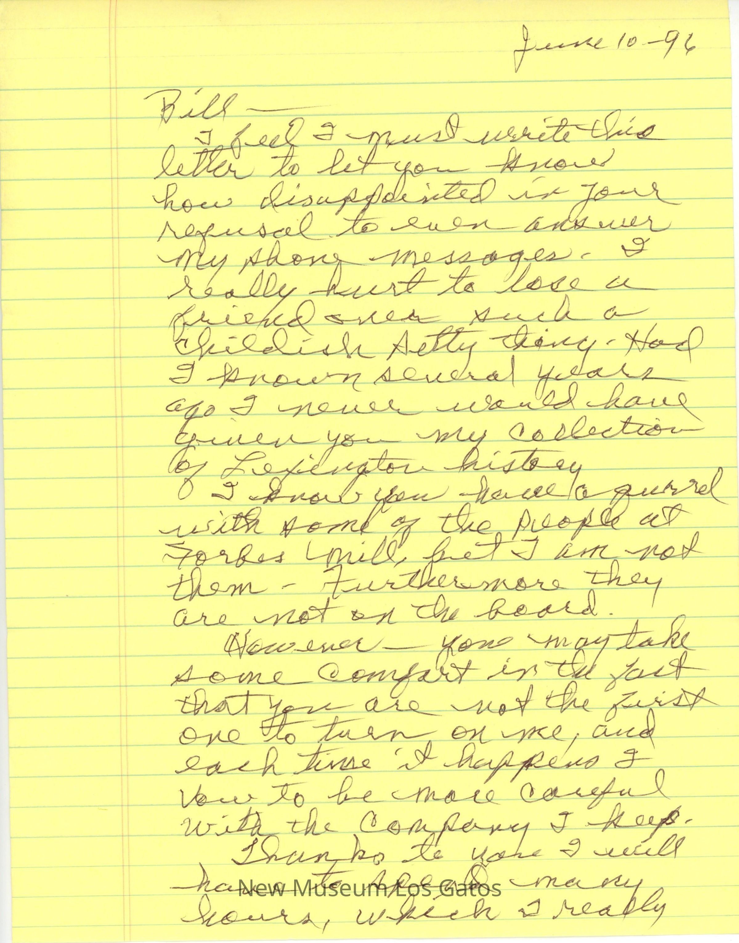 I feel I must write this letter to let you know how disappointed in your refusal to even answer my phone messages. It really hurts to lose a friend over such a childish petty thing. Had I known several years ago I never would have given you my collection of Lexington history.