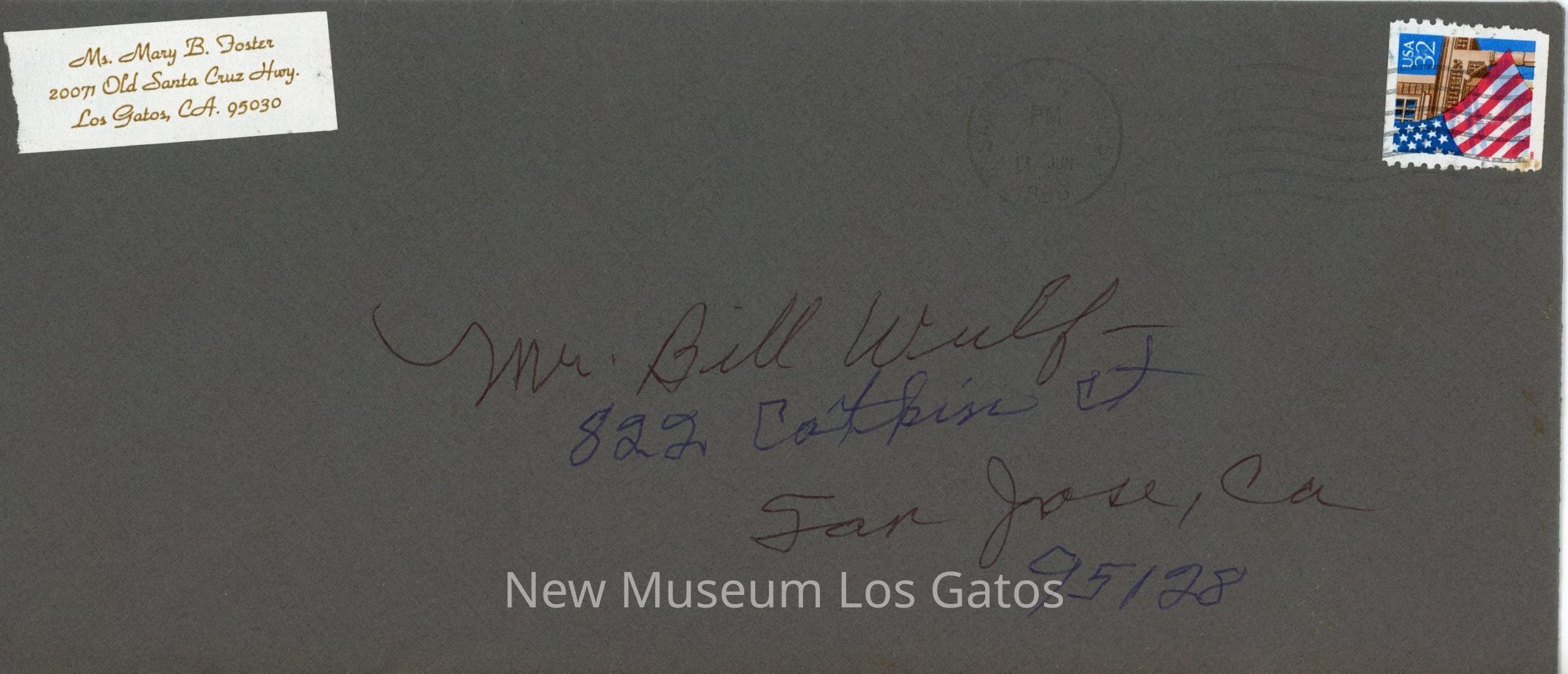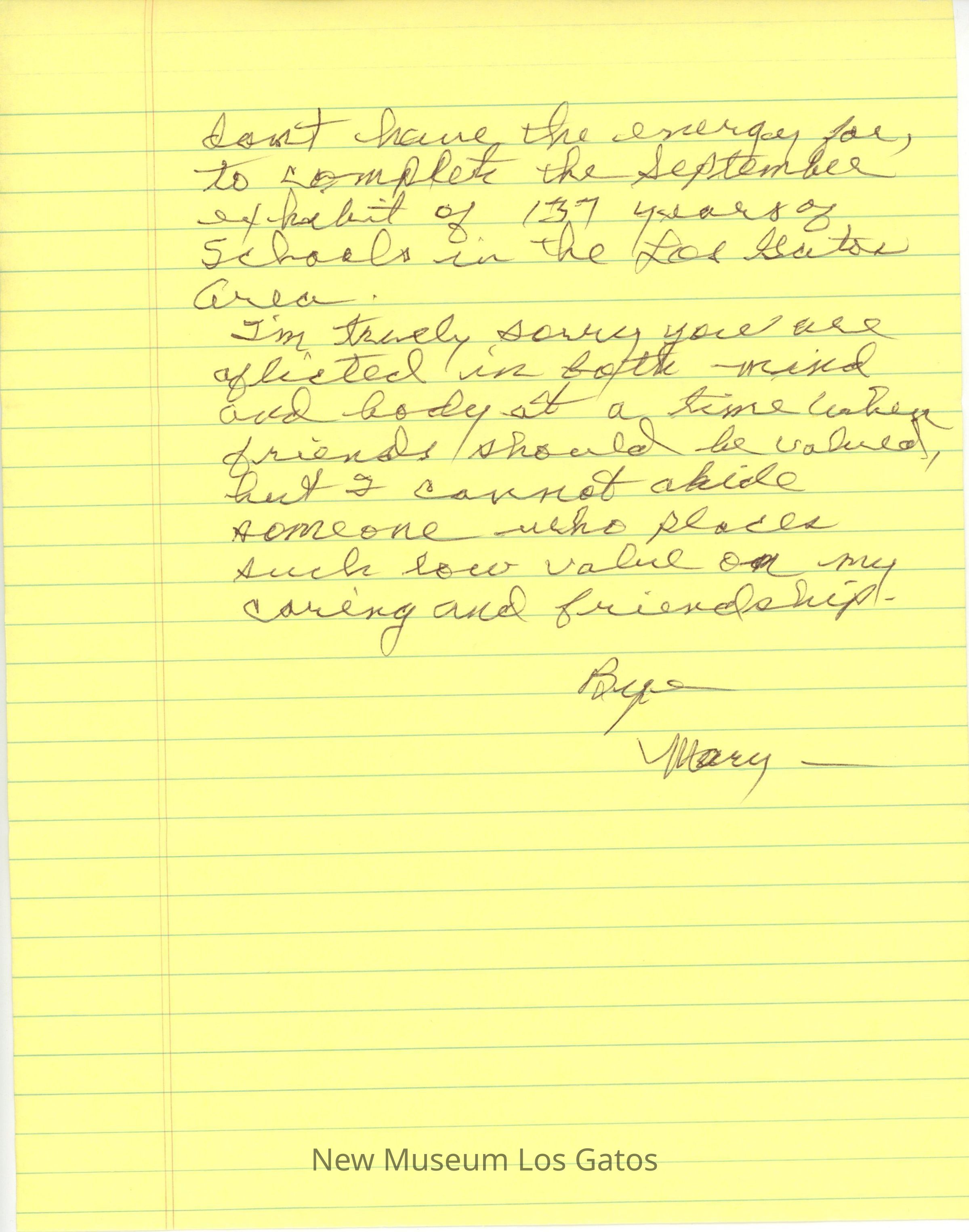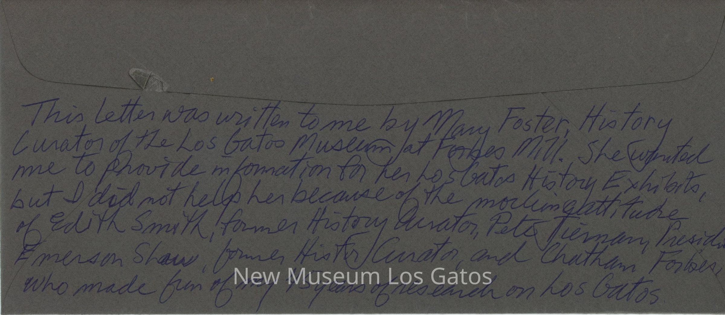 This letter was written to me by Mary Foster, History Curator of the Los Gatos Museum at Forbes Mill. She wanted me to provide information for her Los Gatos History Exhibits, but I did not help her because of the {unintelligible} attitude of Edith Smith, former History Curator, Pete Tiernan, President, Emerson Shaw, former History Curator, and Chatham Forbes who made fun of my 45 years of research on Los Gatos.Language