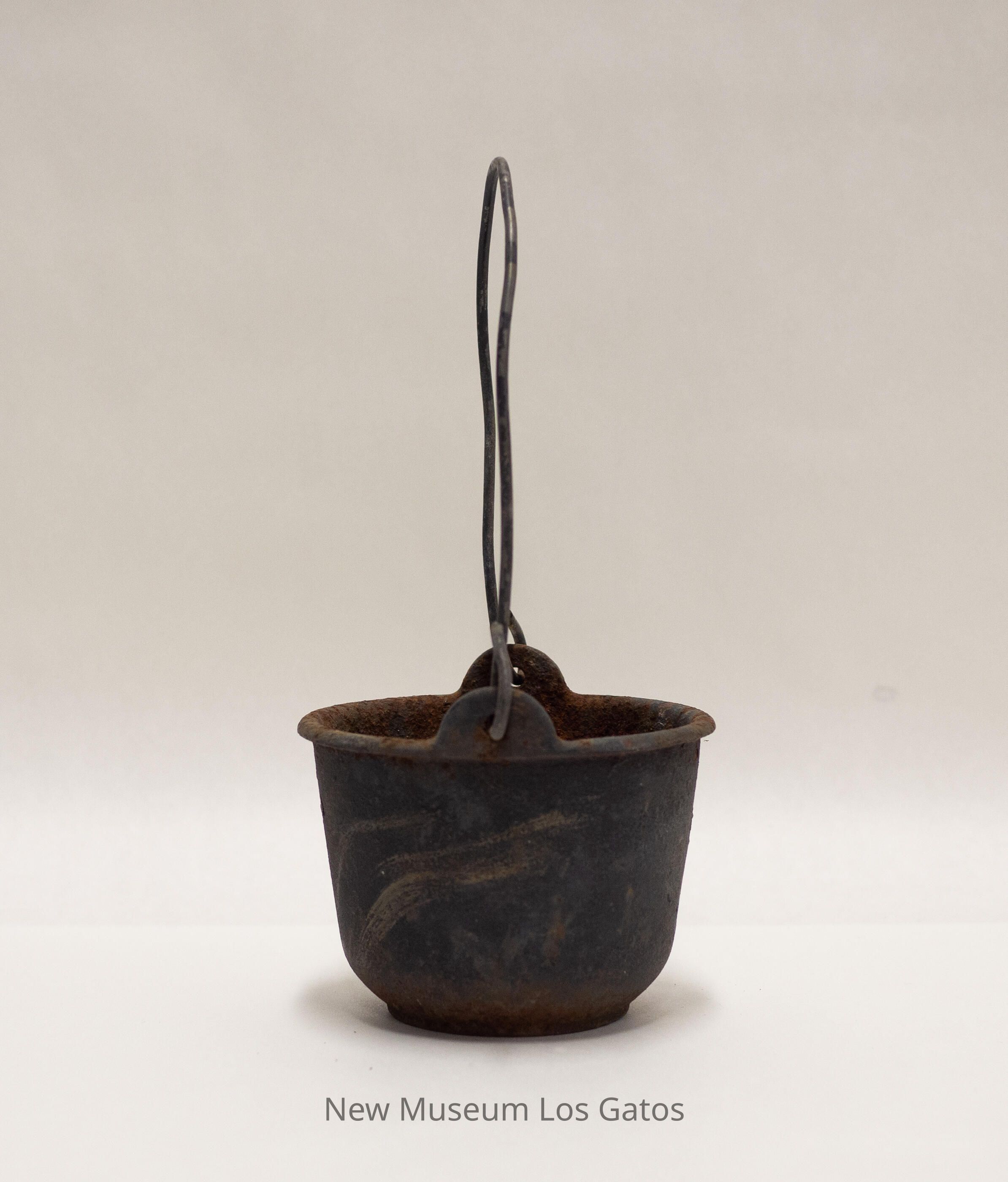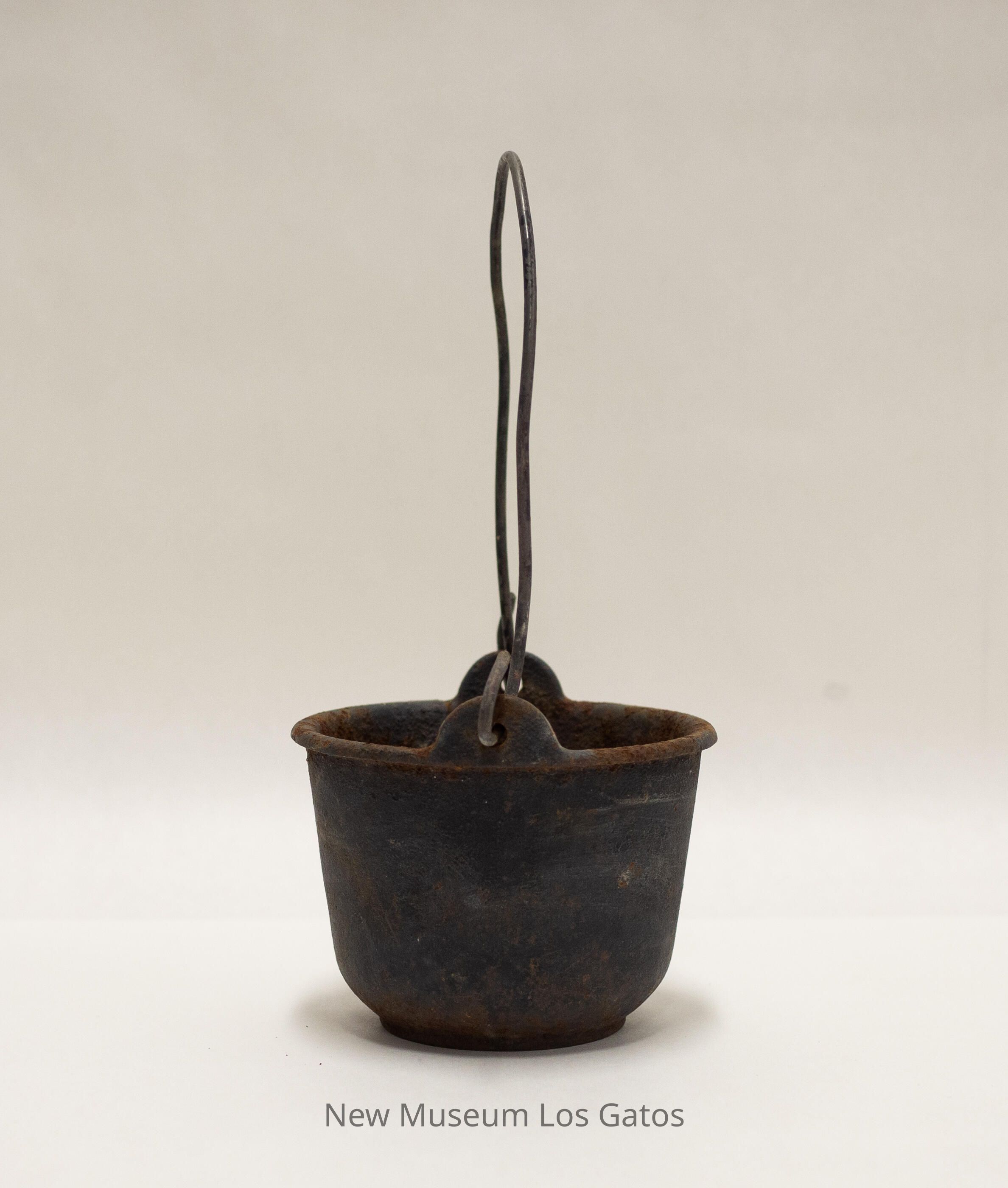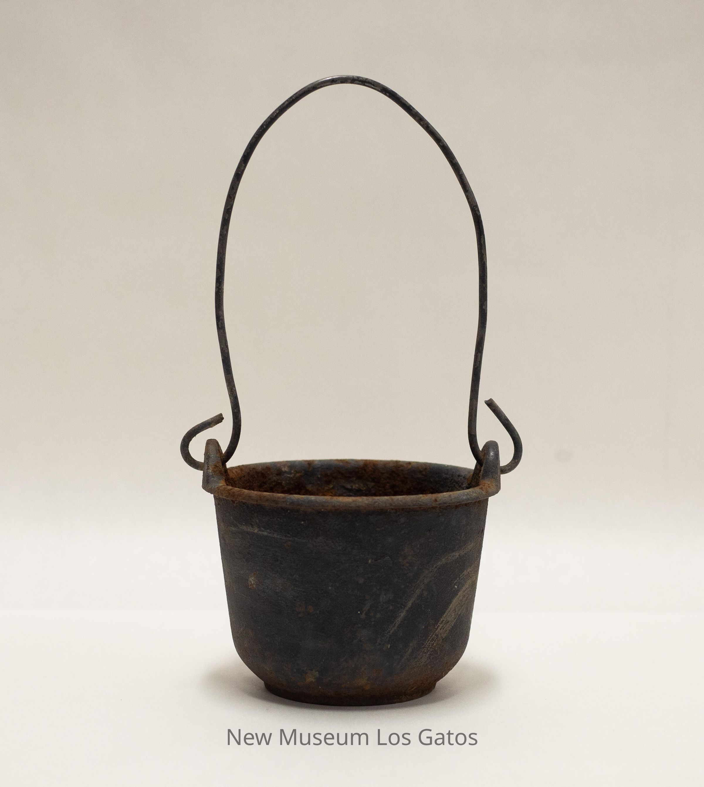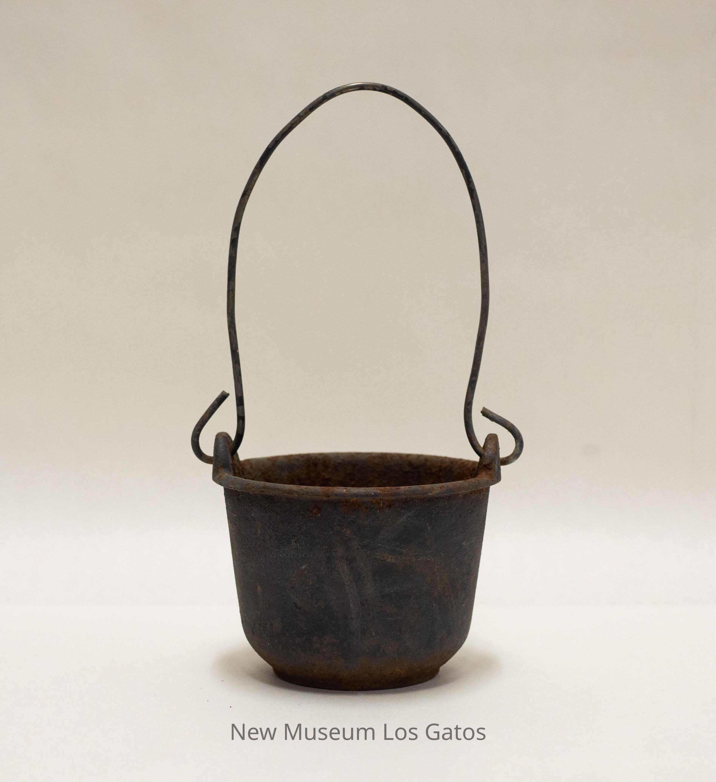 A medium sized metal pot. There is a small lip around the rim of the pot, with two half circles attached to the top of the rim with a hole through the center, through which a curved metal handle is attached.Collection