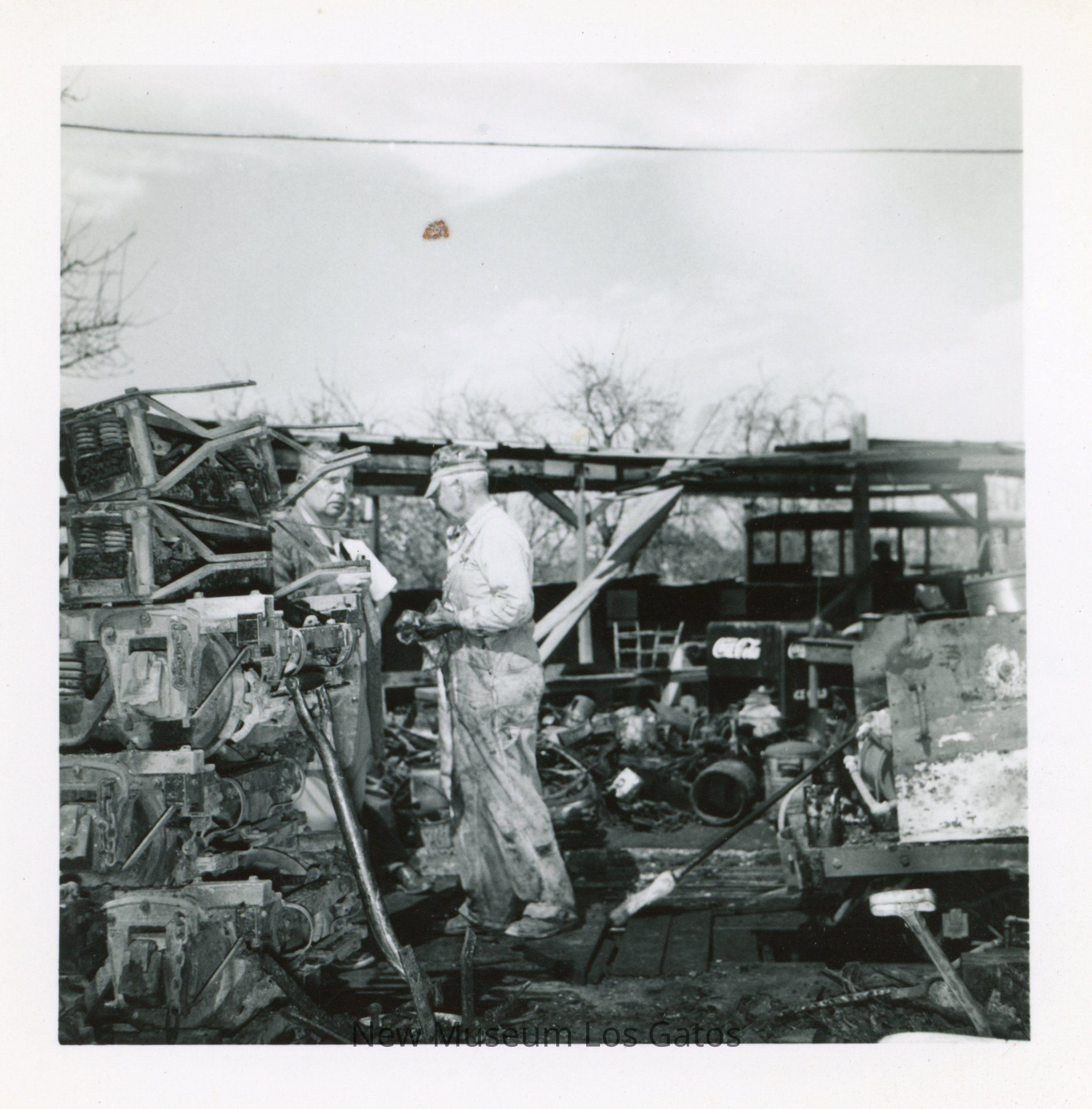 A black and white photograph featuring two men standing in a what appears to be a work yard. The men are standing near the center of the image, surrounded by scrap metal and an assortment of other items. The image is surrounded by a white border.Collection