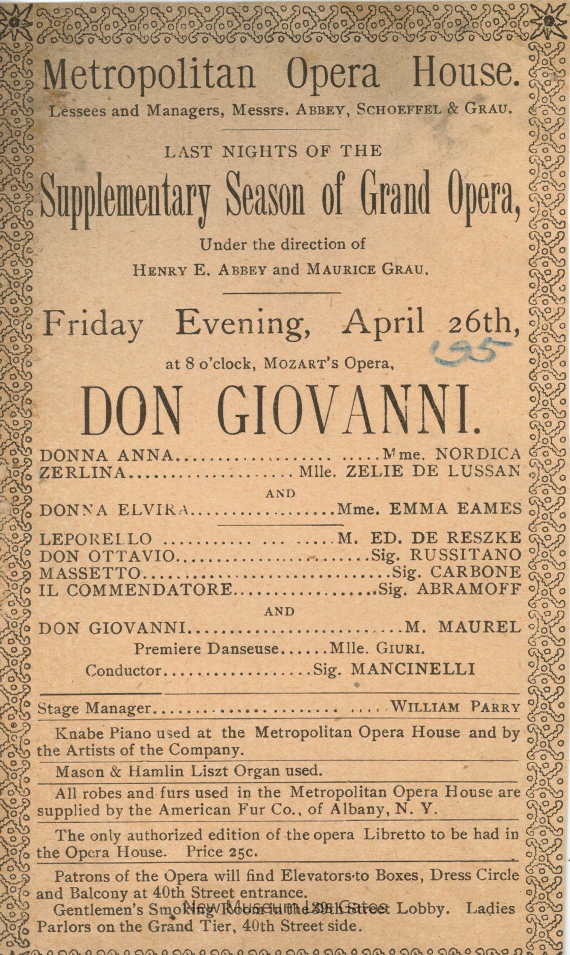 Single-paper program for the opera "Don Giovanni," dated April 26th, 1895. The program lists the cast, synopsis, crew, and executive staff. The program has been cut from a larger piece of paper. There is a small map of the theatre on the reverse side.Collection