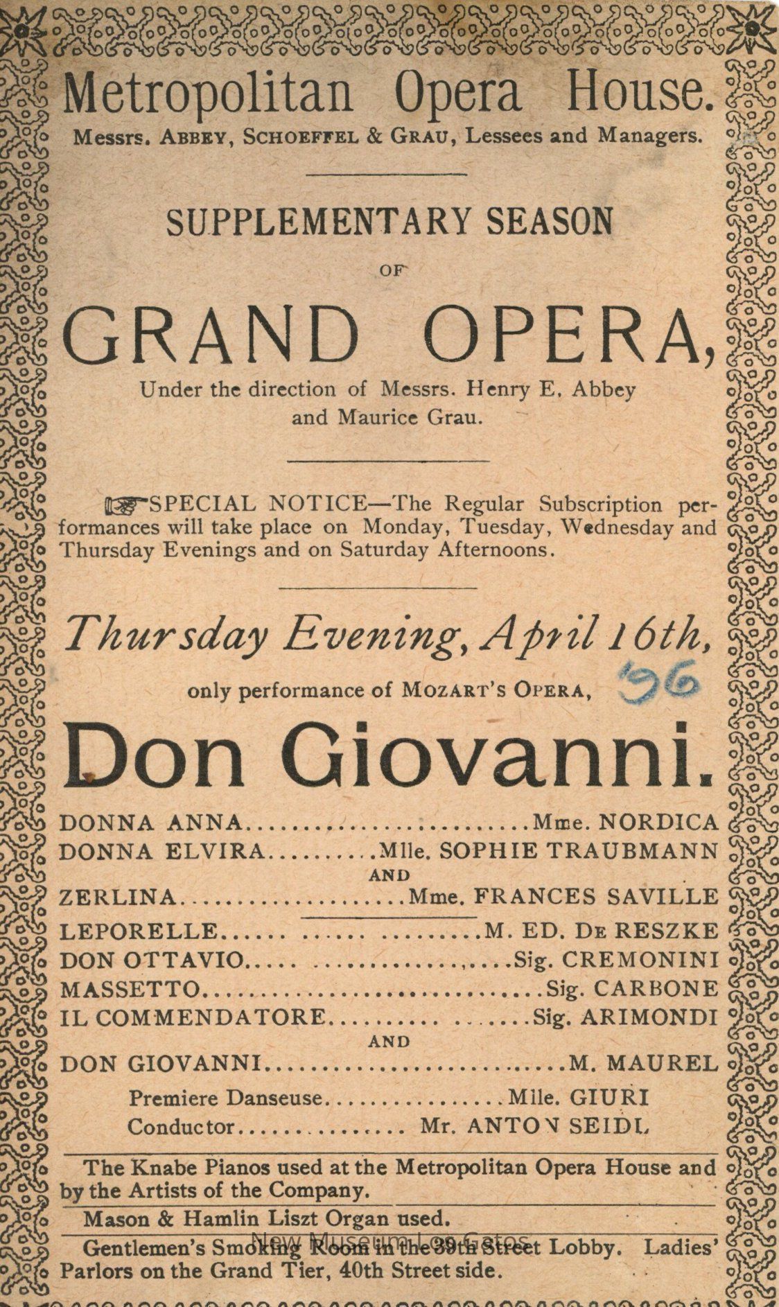 Single-paper program for the opera "Don Giovanni," dated April 16, 1896. The program lists the cast, synopsis, crew, and executive staff. The program has been cut from a larger piece of paper. There is a small map of the theatre on the reverse side.Collection