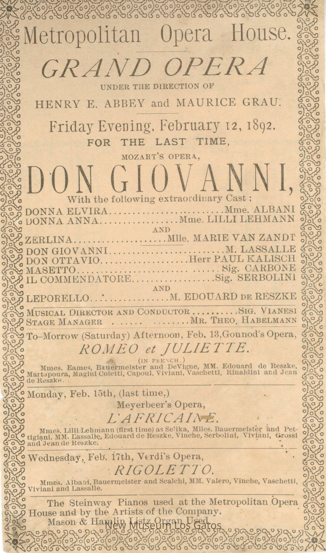 A single-paper program for the opera "Don Giovanni," dated February 12th, 1892. The program lists the cast, crew, and executive staff. The program has been cut from a larger piece of paper. There is a small map of the theatre on the reverse side. The program has advertisements for "Romeo and Juliette," "L' Africaine," and "Rigoletto" at the bottom.Collection