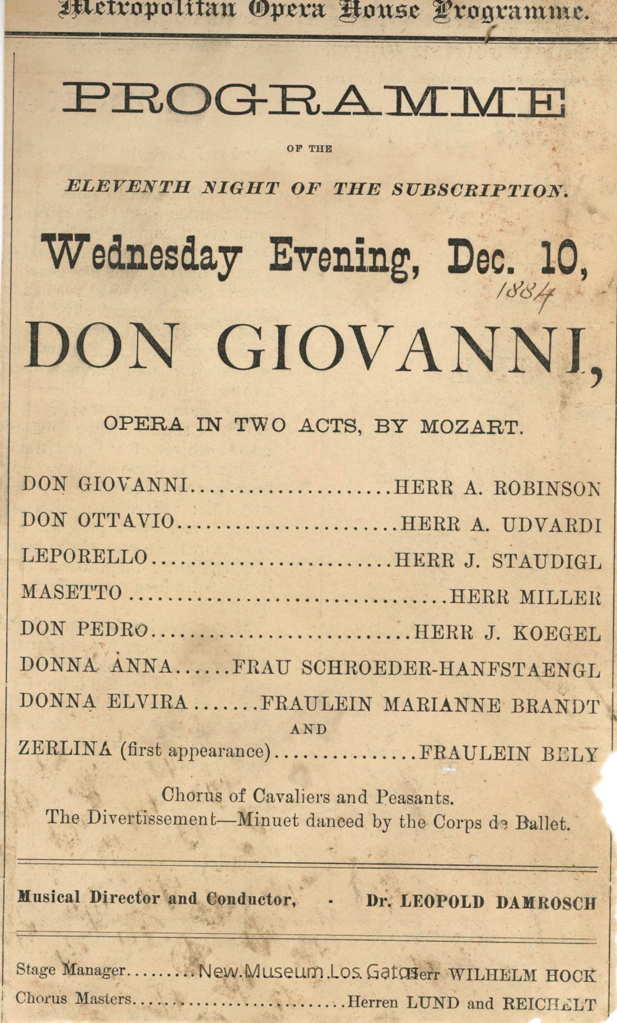 A Single-paper program for the opera "Don Giovanni," dated December 10th, 1884. The program lists the cast, crew, and executive staff. The program has been cut from a larger piece of paper.Collection