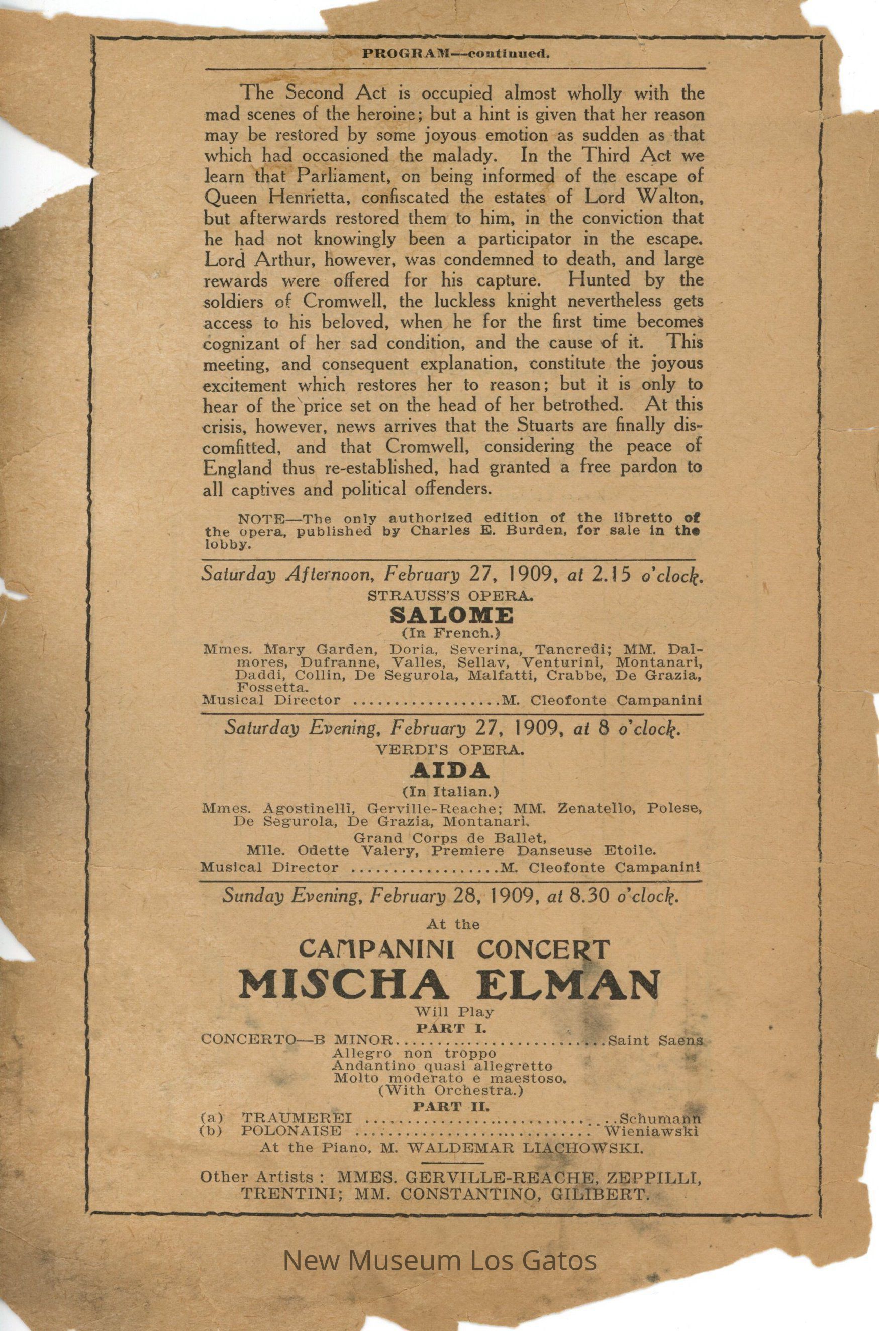 A single-page paper program for the opera "I Puritani," dated February 26, 1909. The program includes a list of the cast, synopsis, setting, and directors.Collection