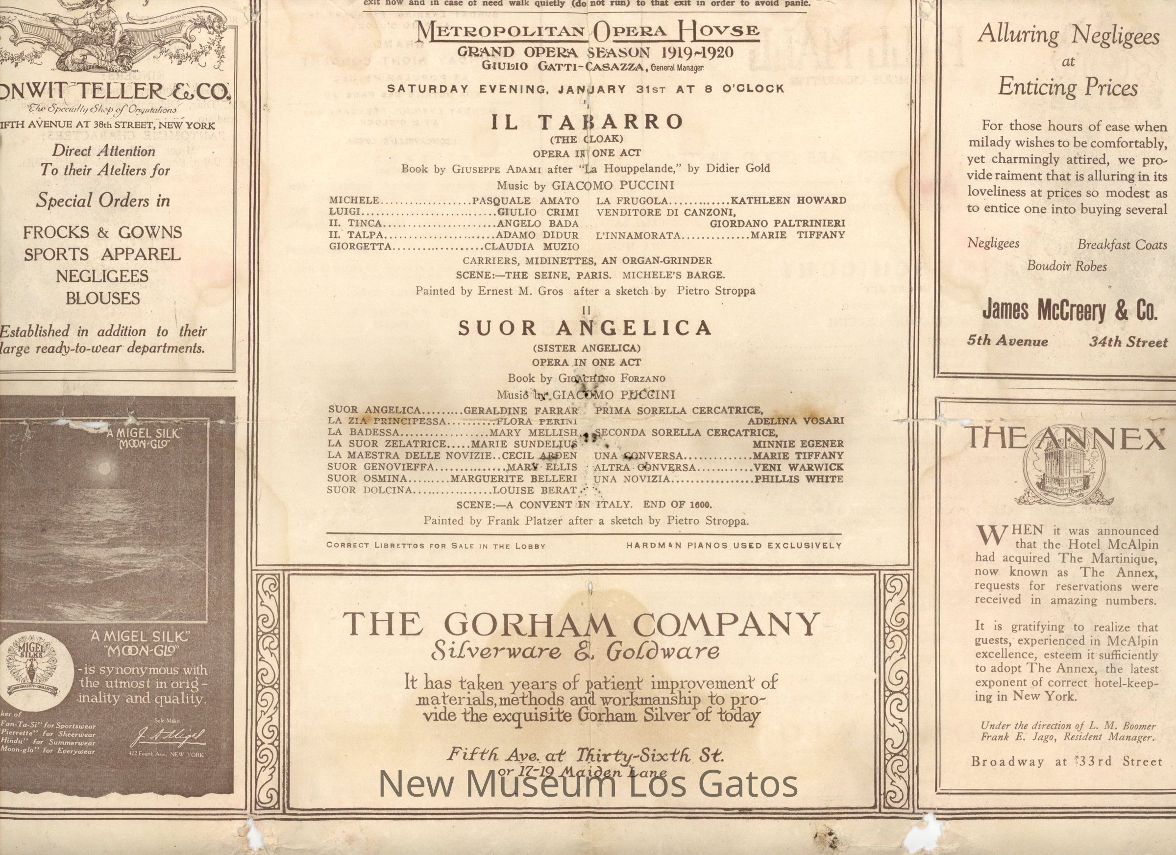 A single-paper program for the opera "Il Tabarro," and "Suor Angelica" dated January 31, 1919. The program lists the cast, stage crew, and directors. The program is surrounded by advertisements.Collection