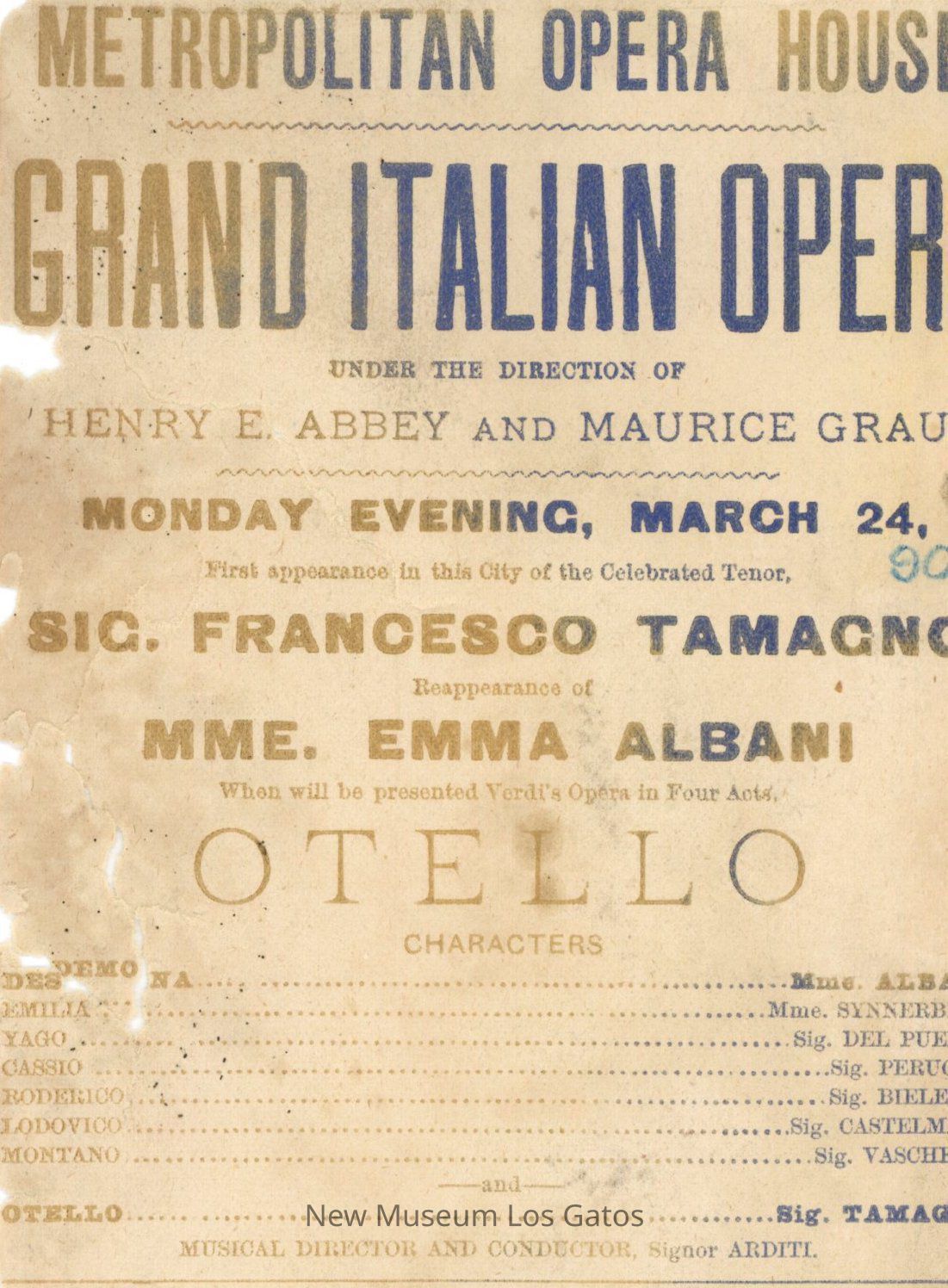 A single-paper program for the opera "Otello," dated March 24, 1890. The program lists the cast and executive staff. The program has been cut from a larger piece of paper.Collection