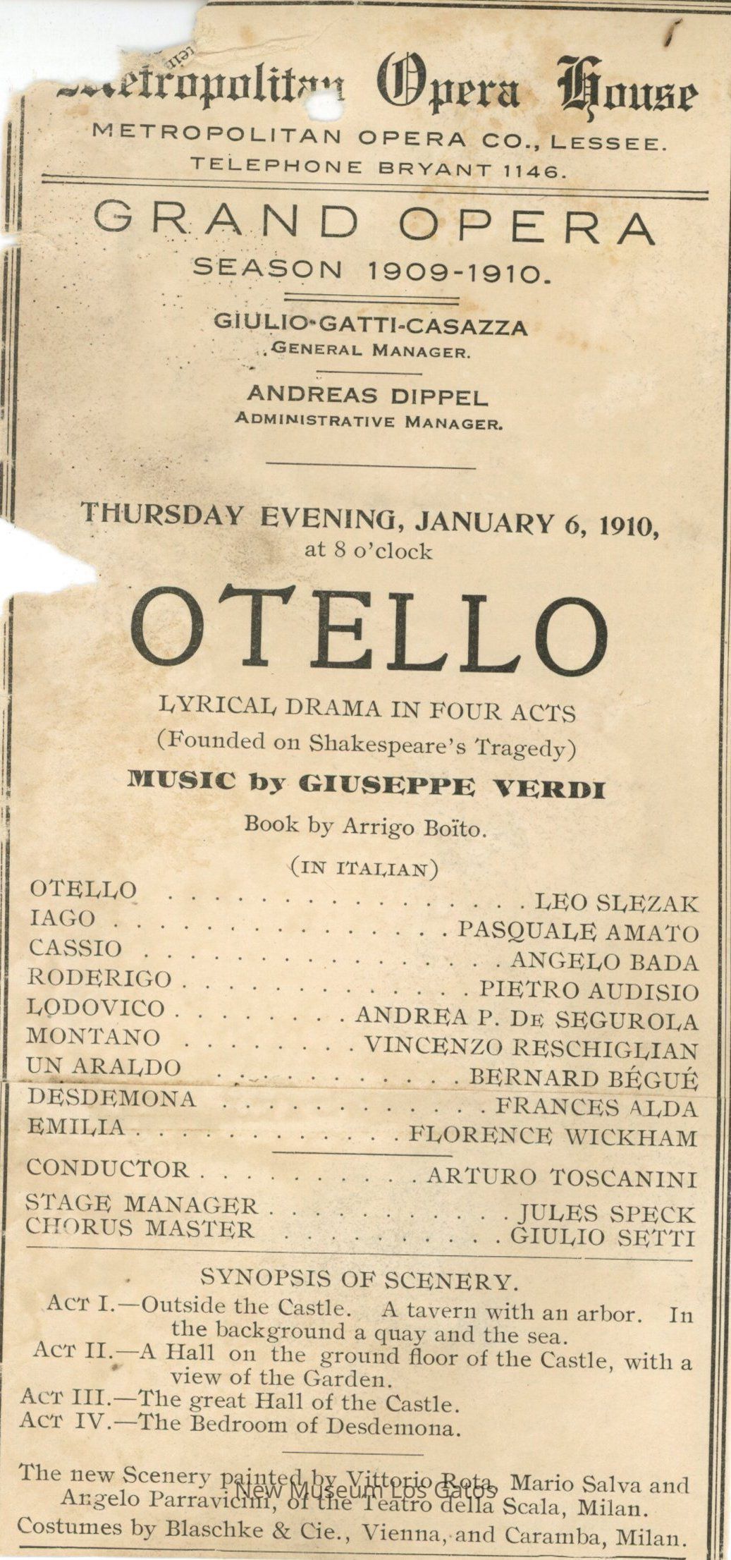 A Single-paper program for the opera "Otello," dated January 6th, 1910. The program lists the cast, synopsis, crew, and executive staff. The program has been cut from a larger piece of paper, and the lower portion is glued to the upper.Collection