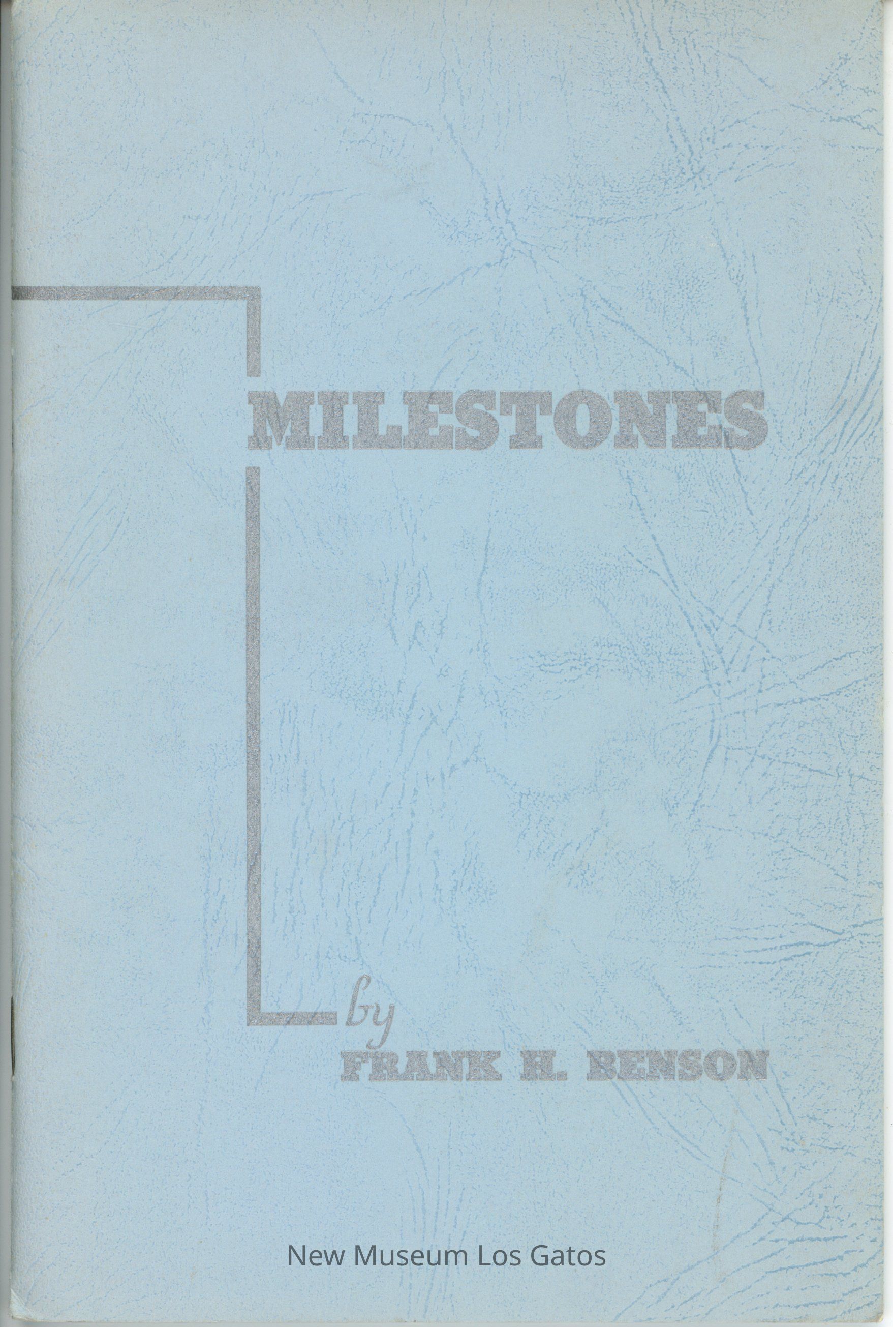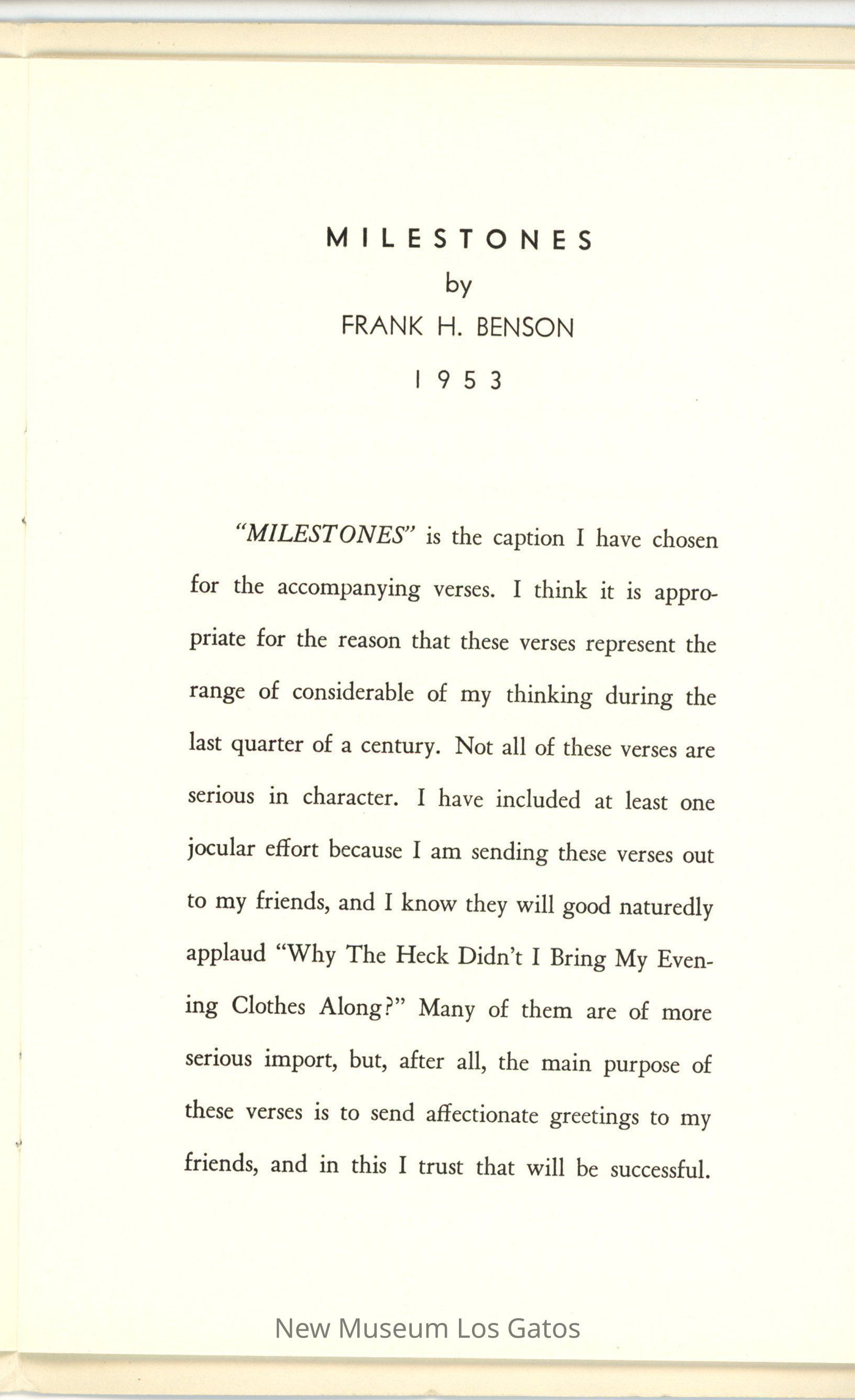 Blue paper booklet of self-published poems and verses by author Frank H. Benson. There is a Christmas card tucked into the book from the author.Collection