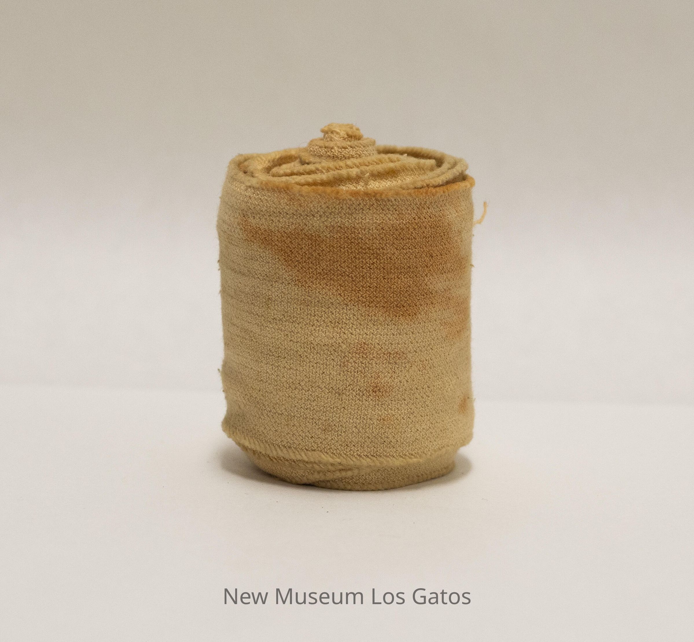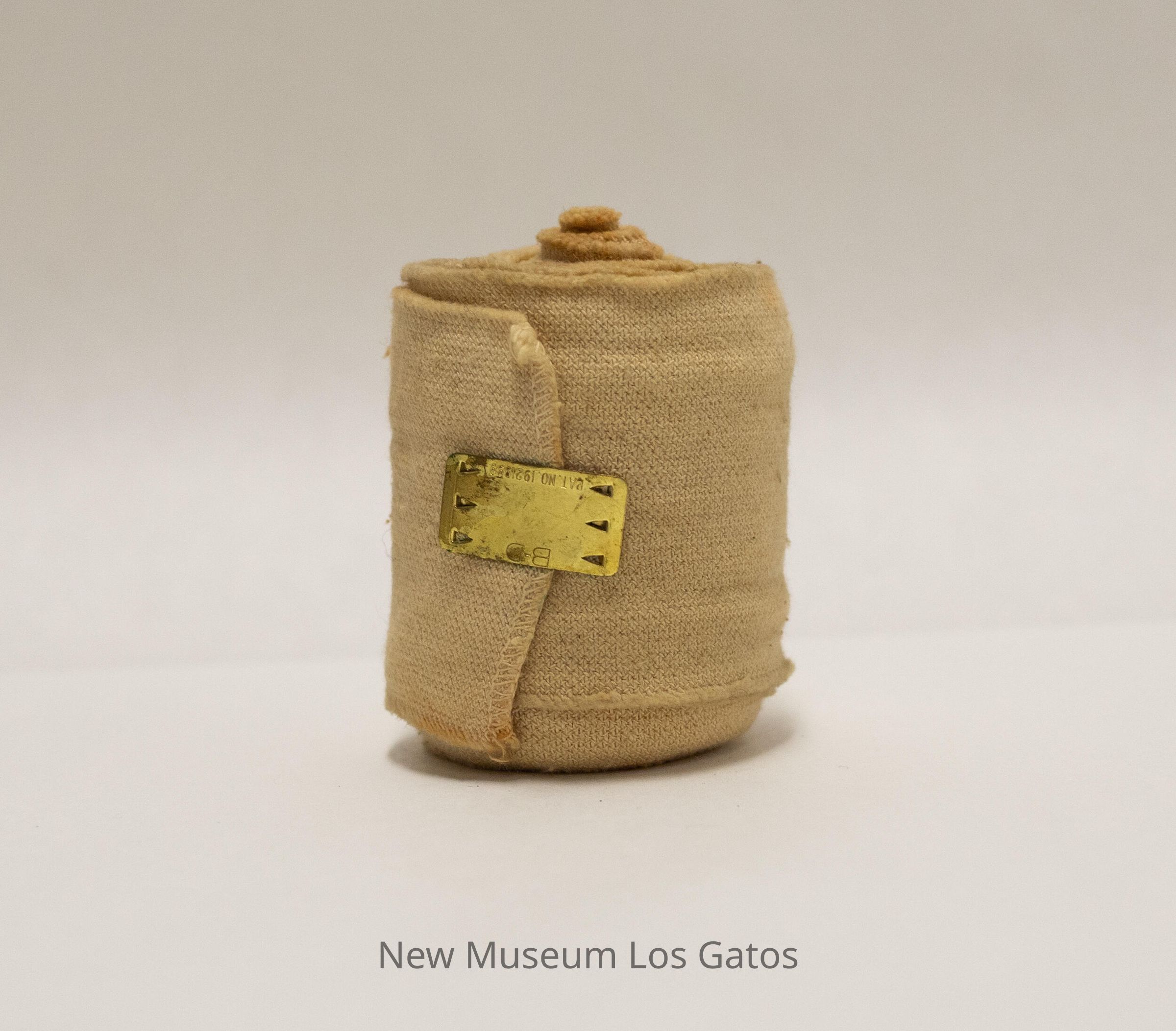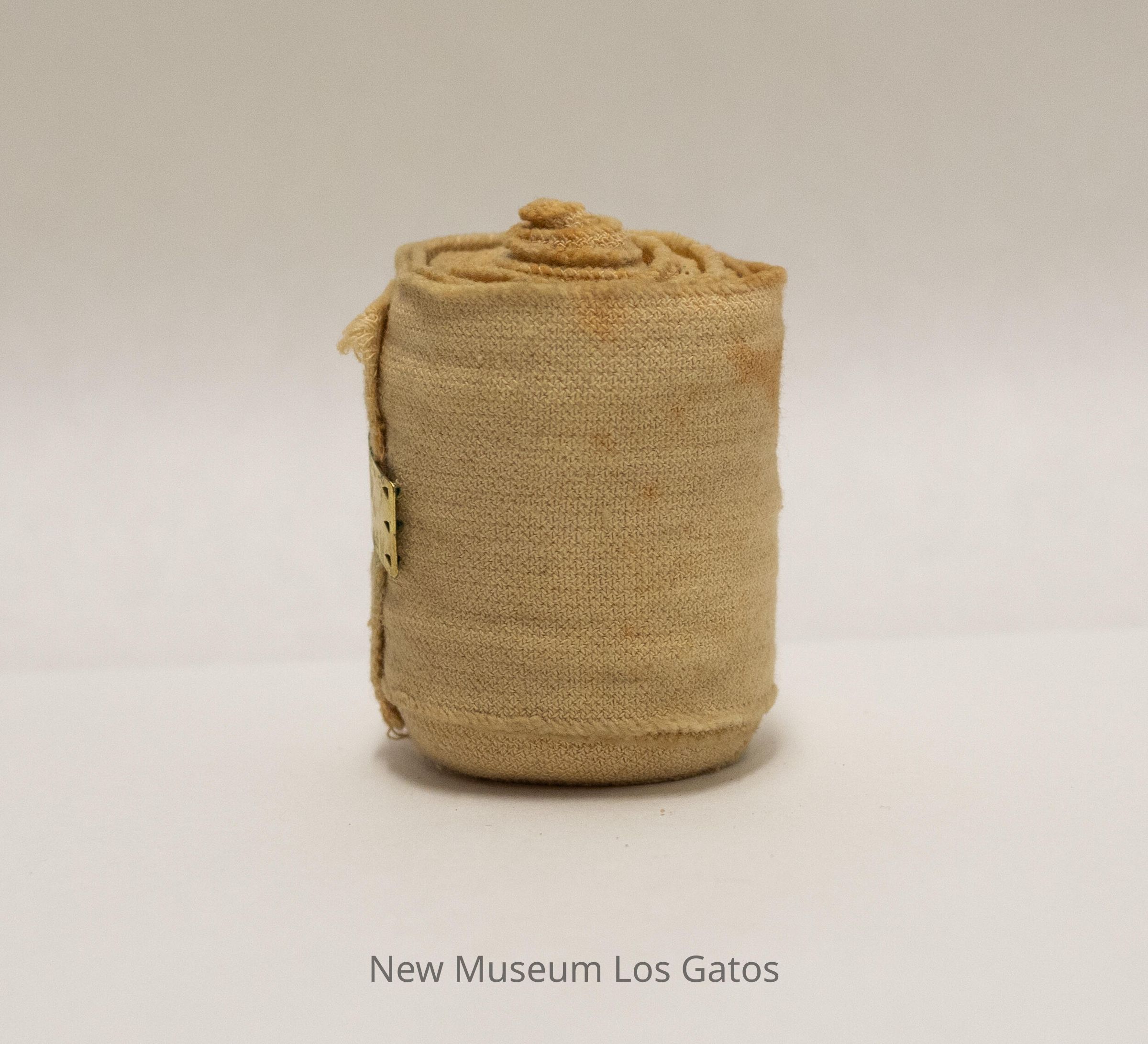A roll of Ace bandage, secured with a brass clip with three teeth on each side of the clip.Collection