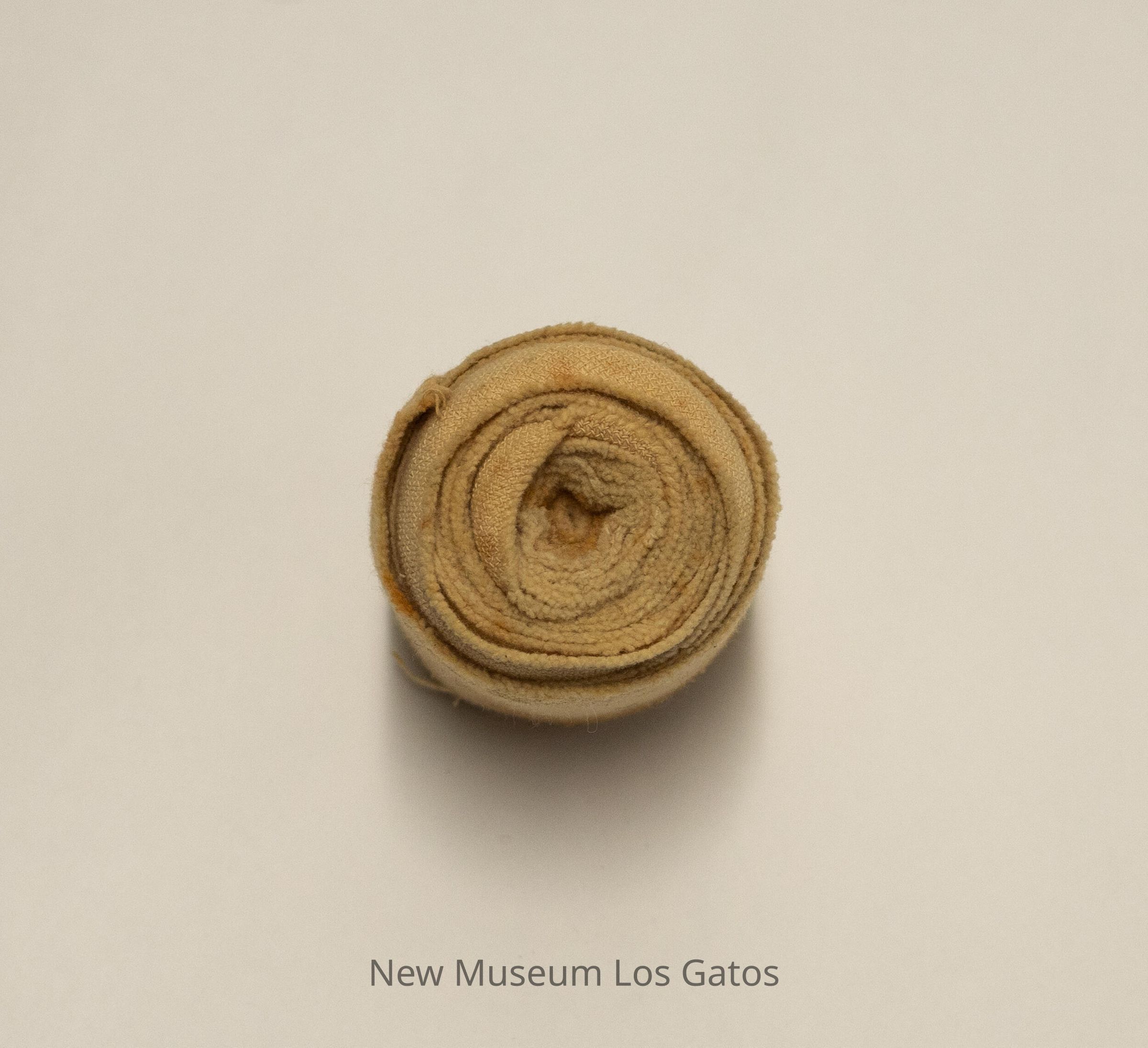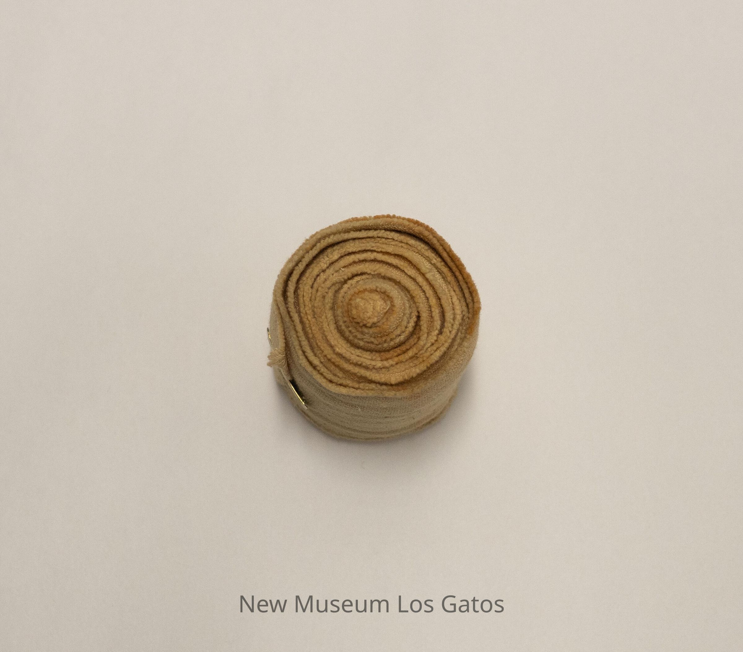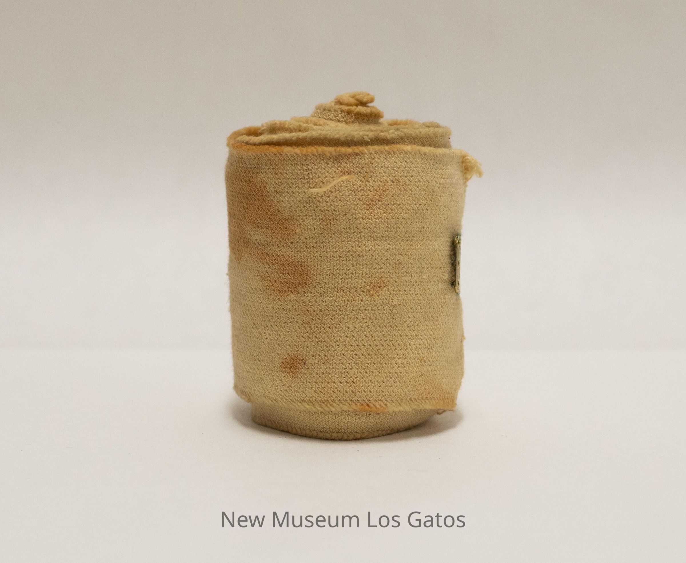 A roll of Ace bandage, secured with a brass clip with three teeth on each side of the clip.Collection