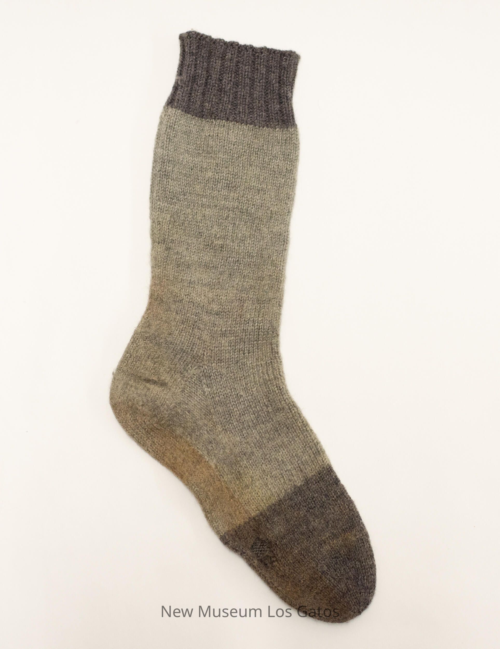 A single, green knitted wool sock. The main body of the sock is lighter green, while the toe and the top are a darker green/gray.