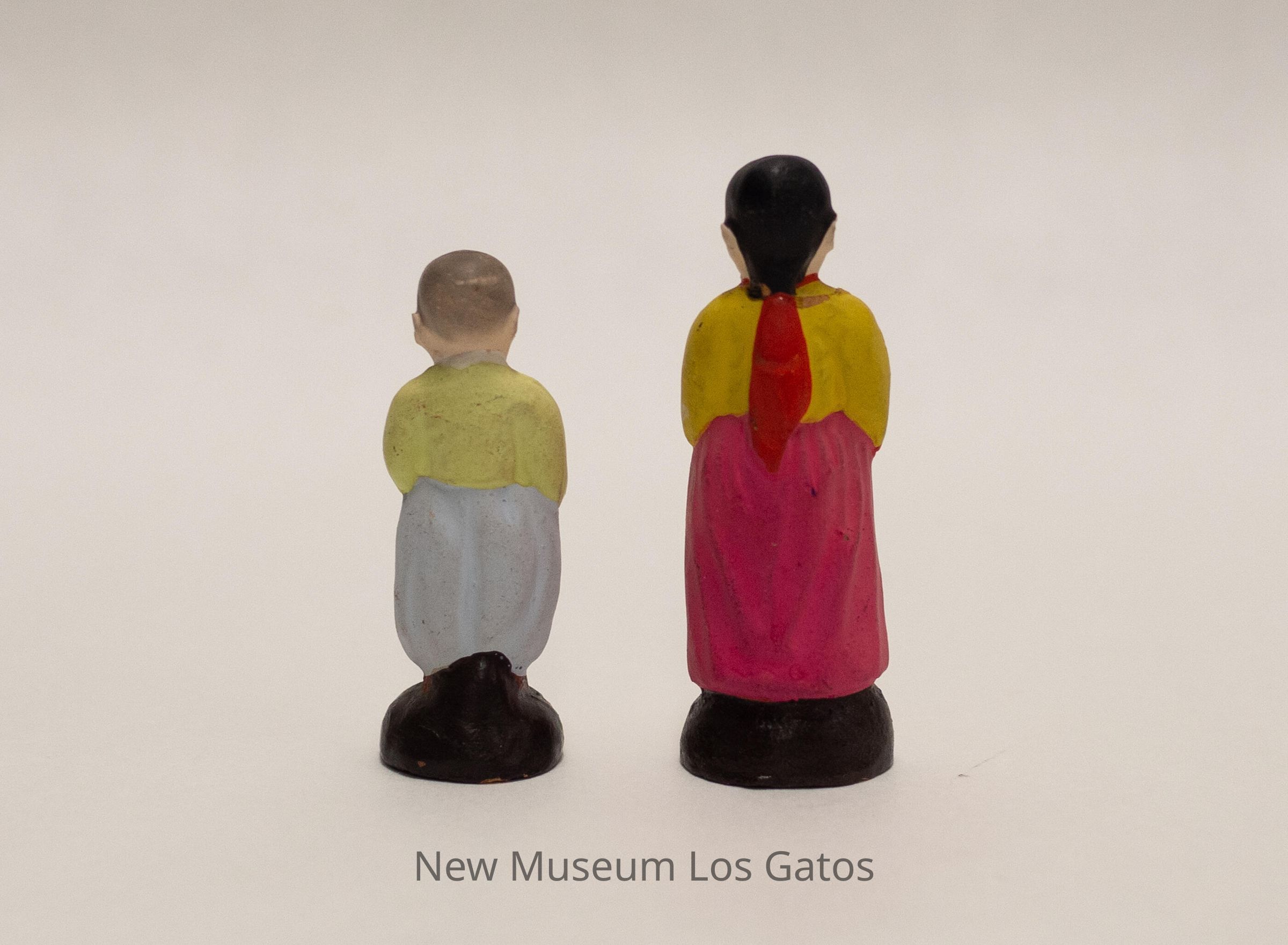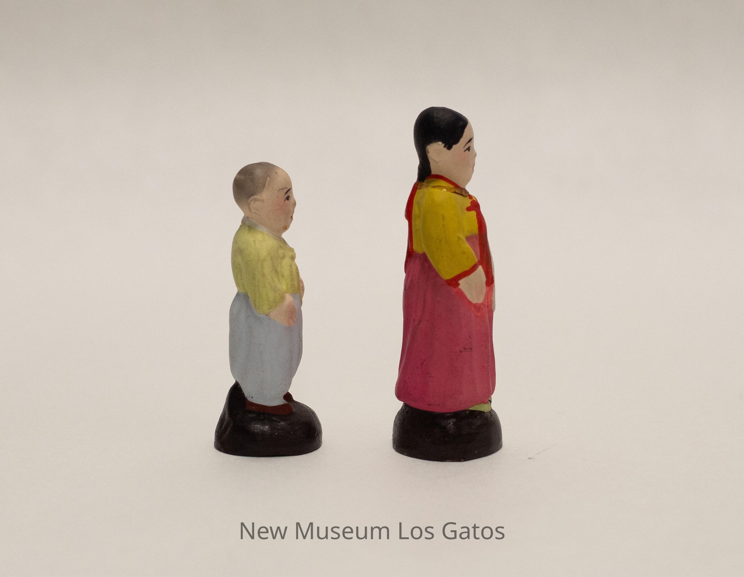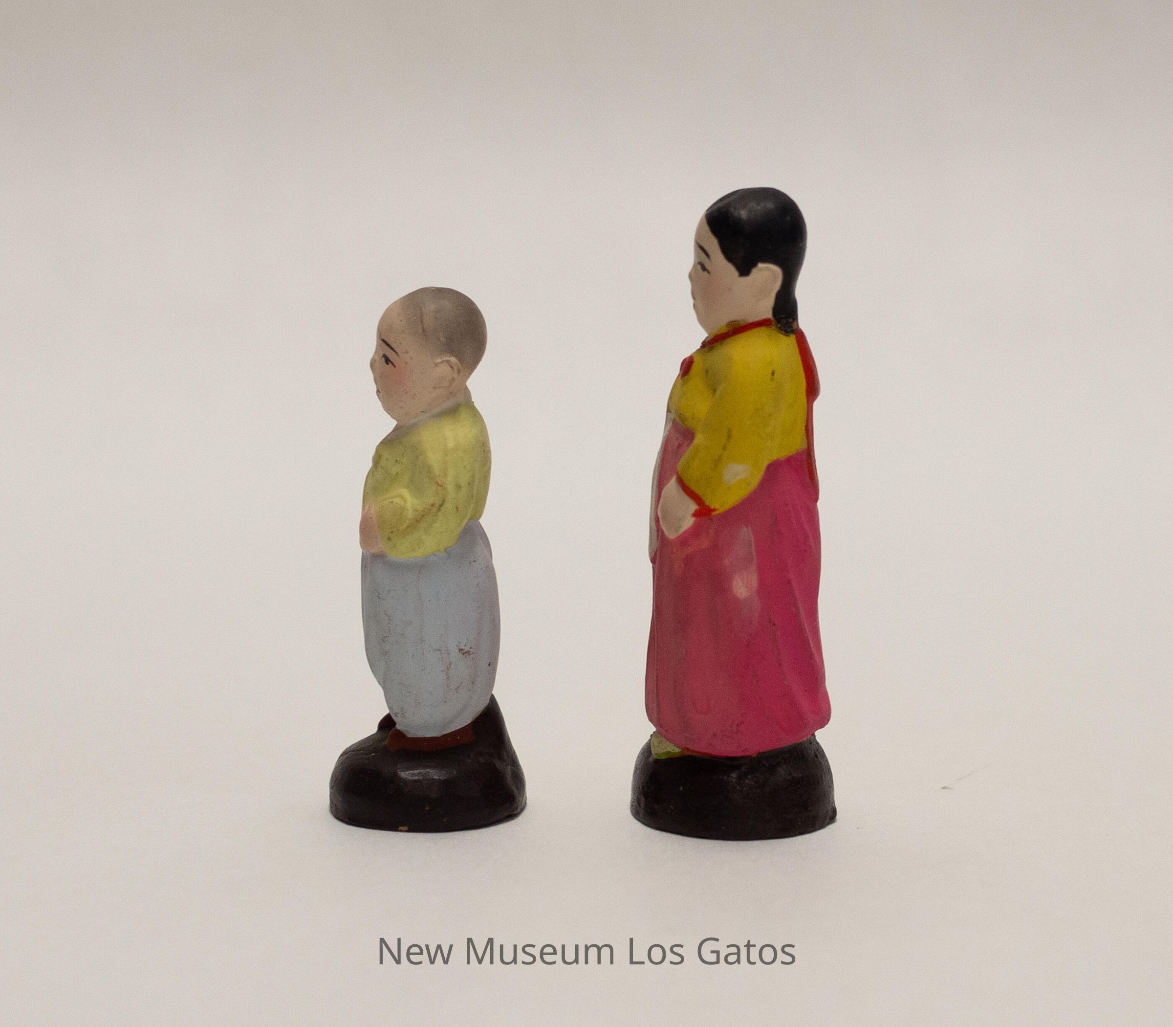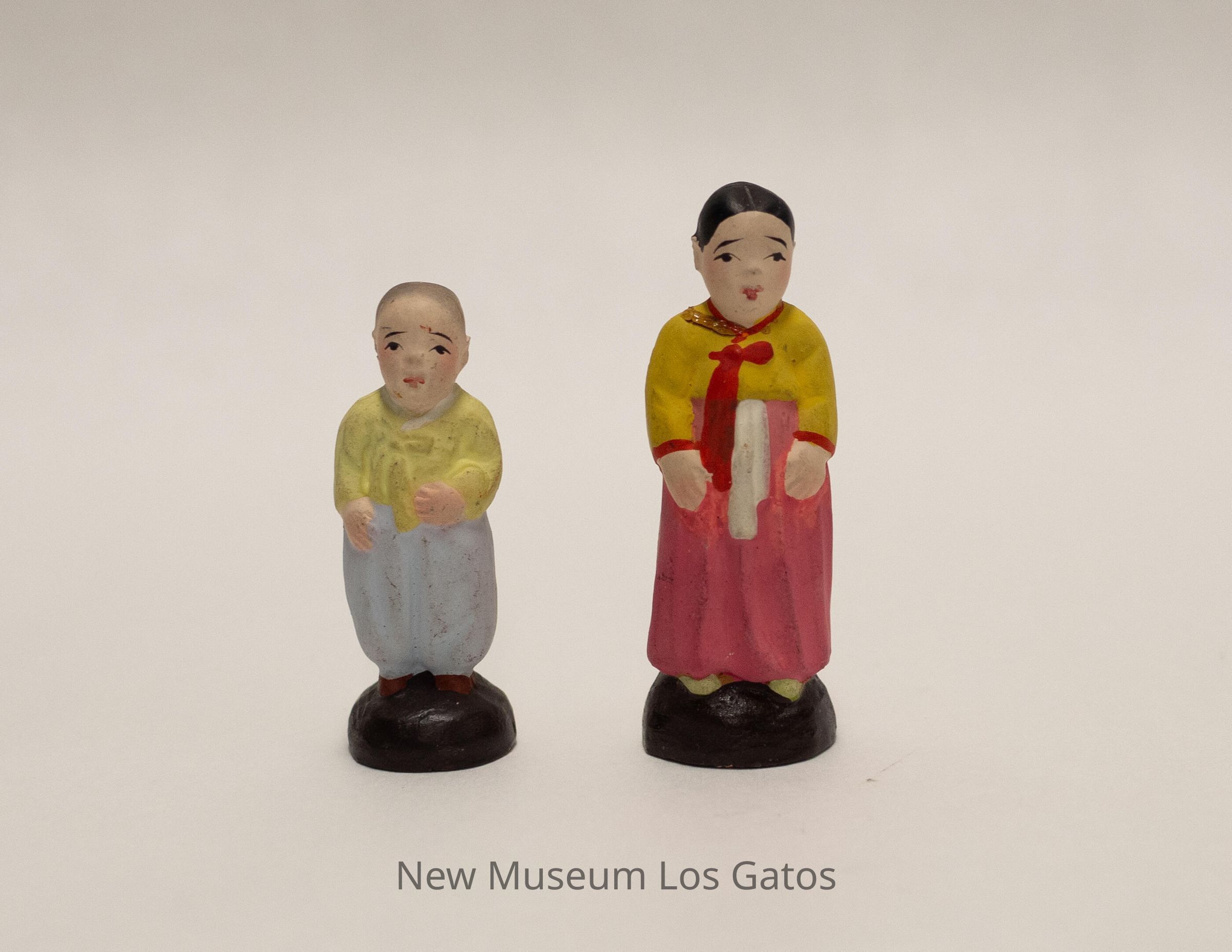 A pair of miniature ceramic, painted figurines. The first figurine is female, and is wearing a pink skirt with white ties in the front and a yellow top with a red bow in the front. The figurine's hair is black and in a braid, with a red bow at the end. The second figurine is male, and is wearing brown shoes, light blue pants, and a light lime green top. The figurine's hair is a very light gray, giving the appearance of baldness/a shaved head, possibly indicating that the male is young. Both figurines are standing on a domed, brown base.Collection