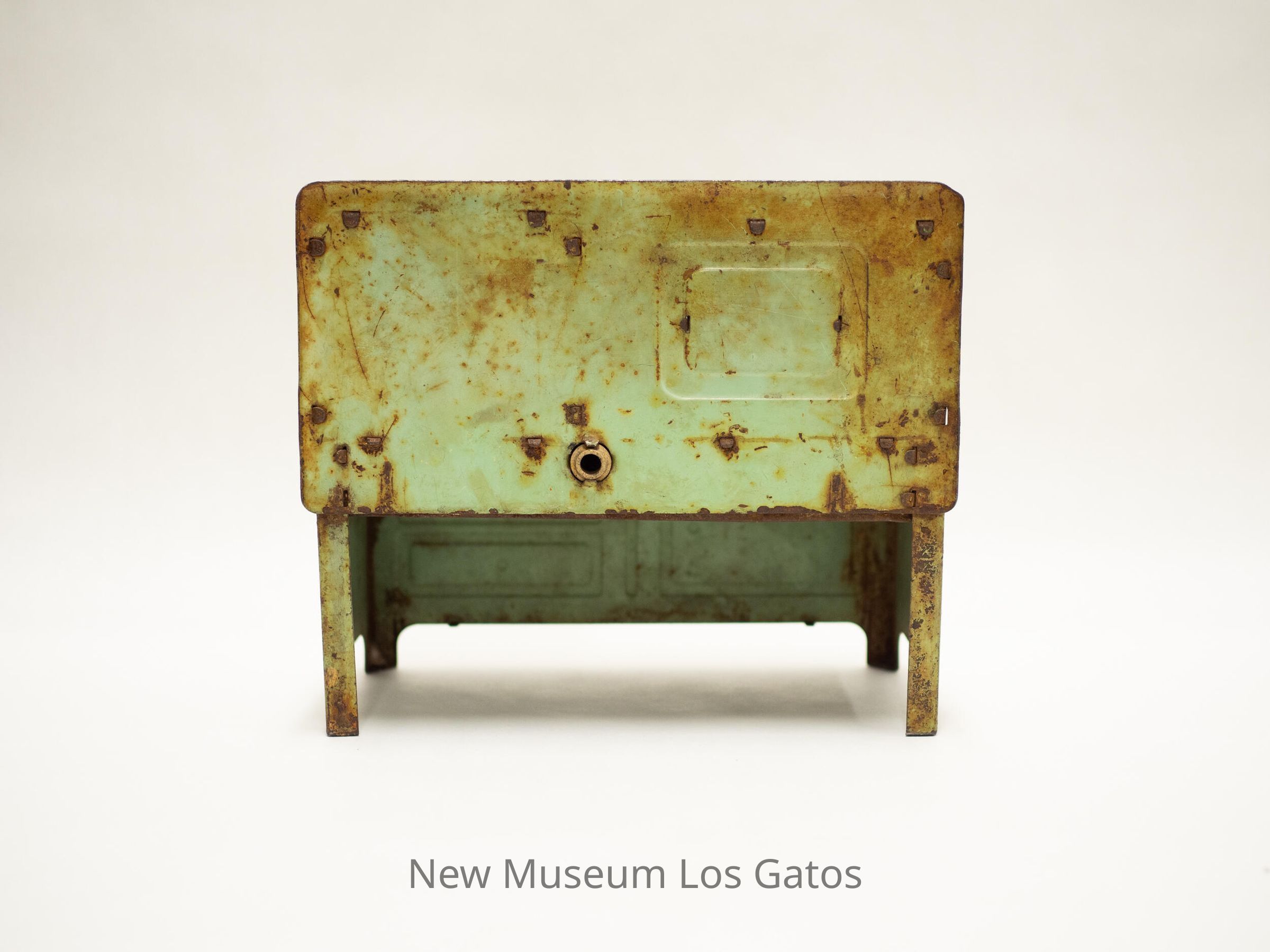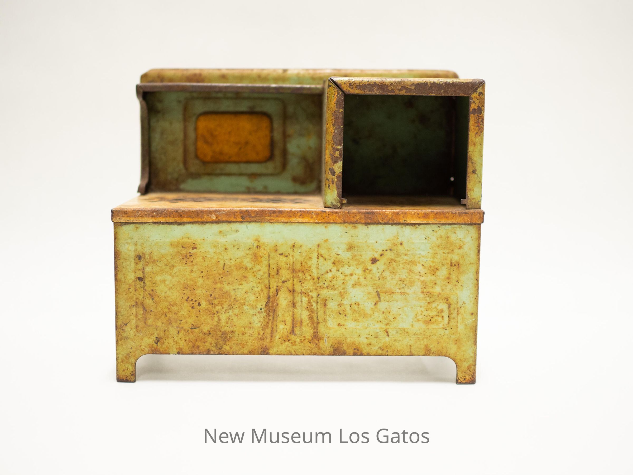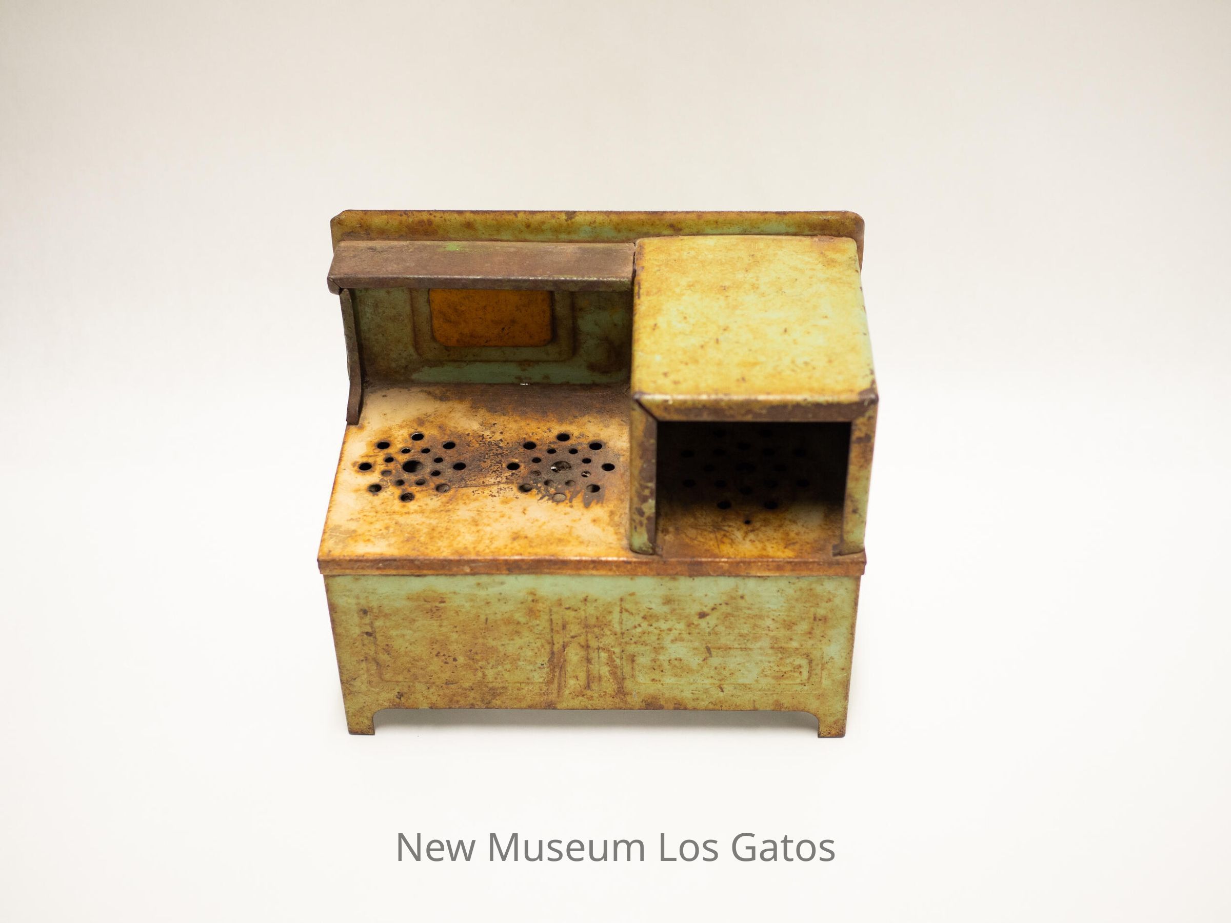 Metal miniature kitchen range, possibly a toy. Originally green but rusted throughout, features an enclosed oven and two stovetop burners.Collection