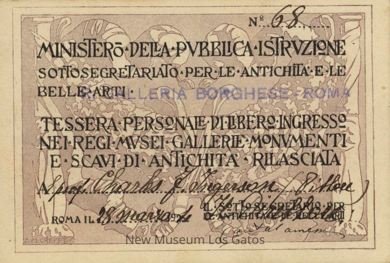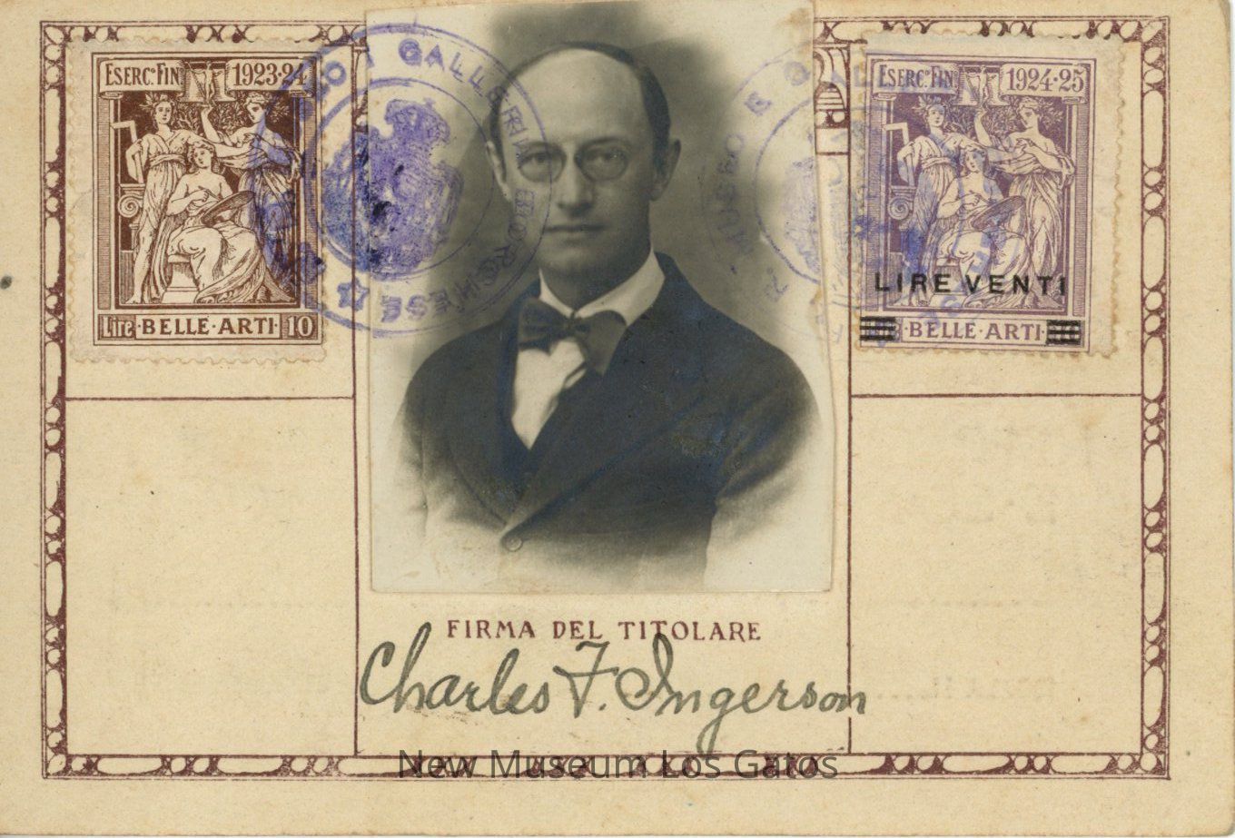Small stock identification card for the Ministry of Instruction, for the department of Antiques and Fine Artillery at the Borghese Gallery and Museum in Rome, Italy. The card has a photograph of Charles Frank Ingerson on the front, and is signed on both sides. The card is dated 18 March, 1924. The card has two stamps on the front, flanking either side of the photograph.Collection