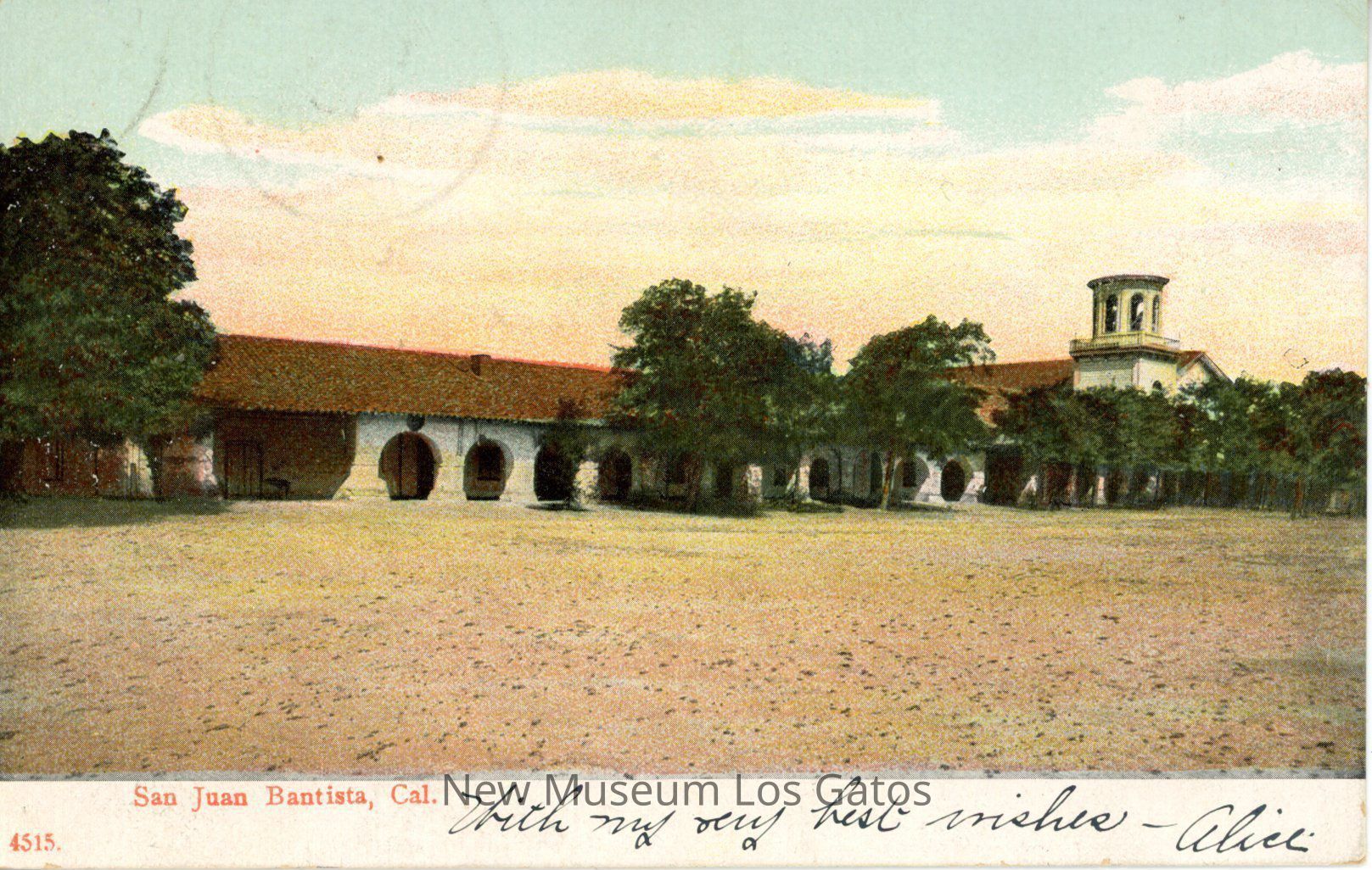 A colorized postcard featuring Mission San Juan Bautista. The postcard has been mailed, and includes an addressee, a stamp, and a message written in pen.Subject Place