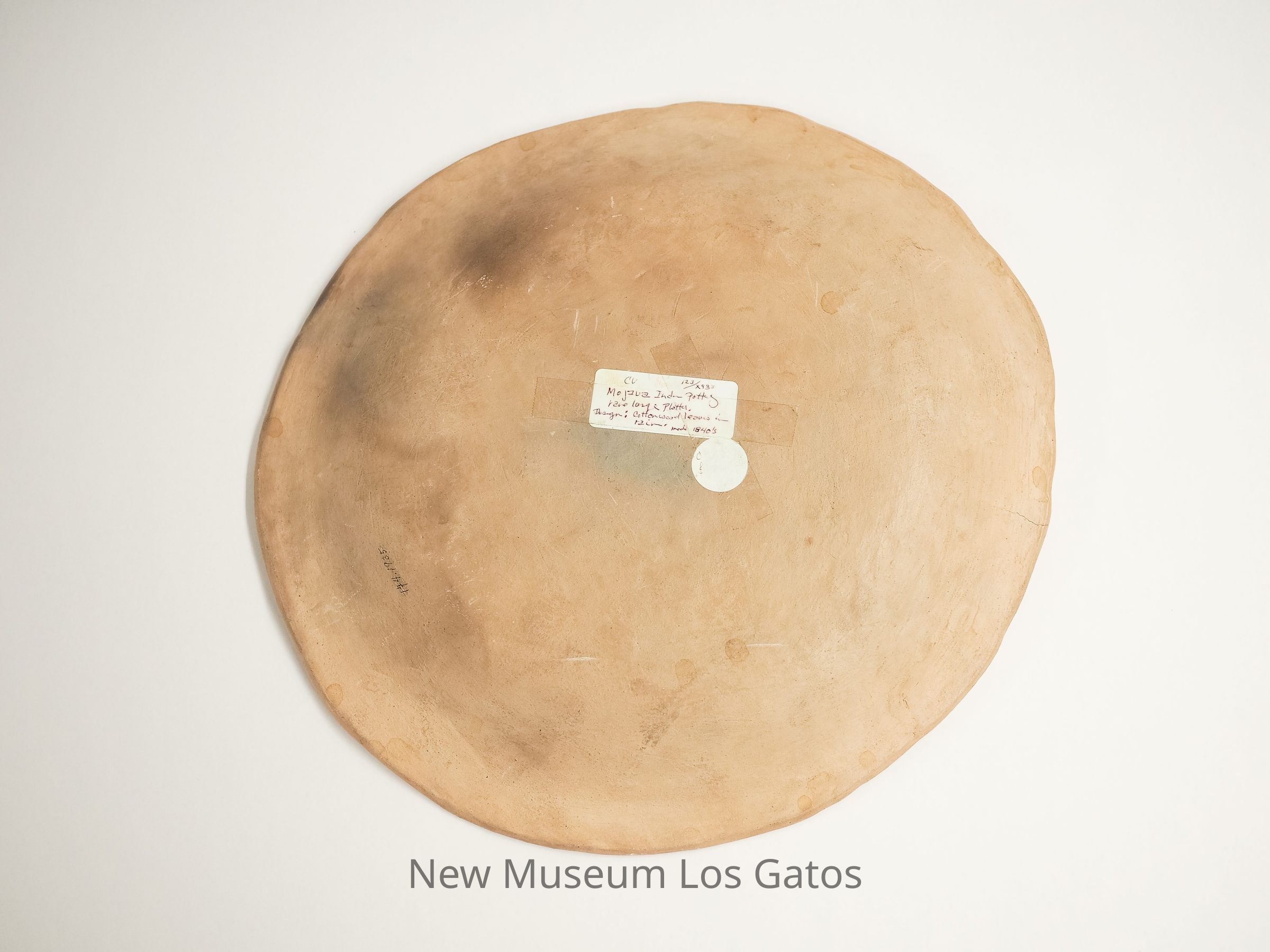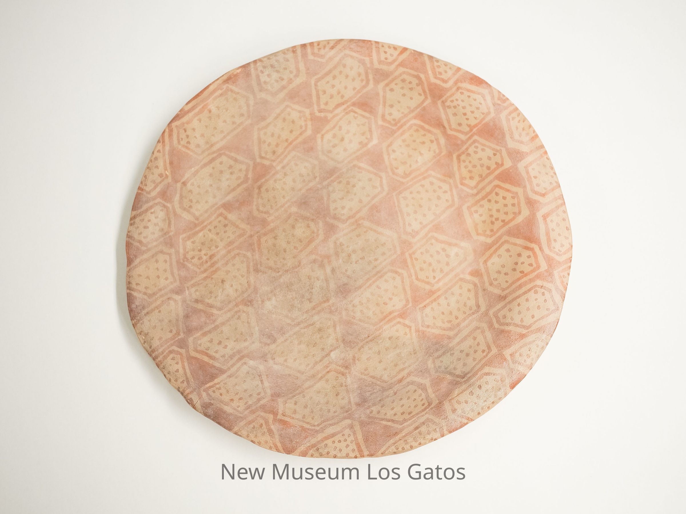 A large, flat ceramic platter made by the Mojave people. It is a pale beige color, with an orange painted design.Collection