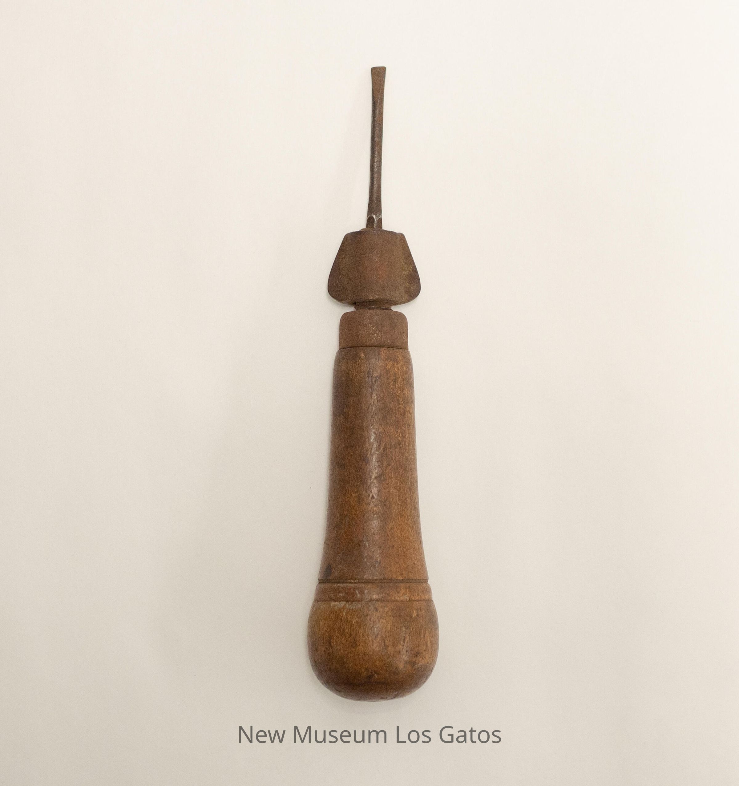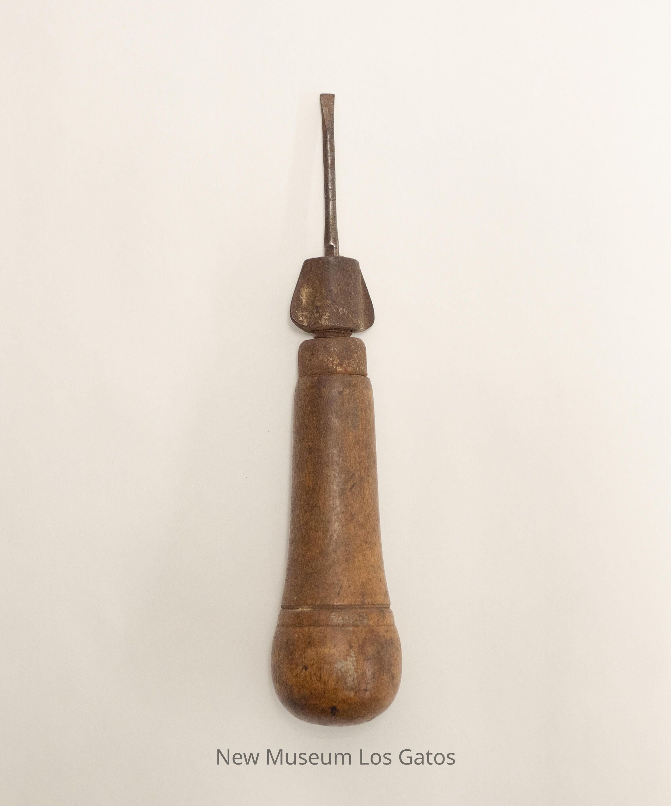 A multi-tool with a wooden handle and metal bit. The wooden handle is round and circular towards the bottom, and tapers towards to top. At the base of the handle is a metal piece that unscrews to hold a variety of bits; currently in the tool is a metal flathead screwdriver.Collection