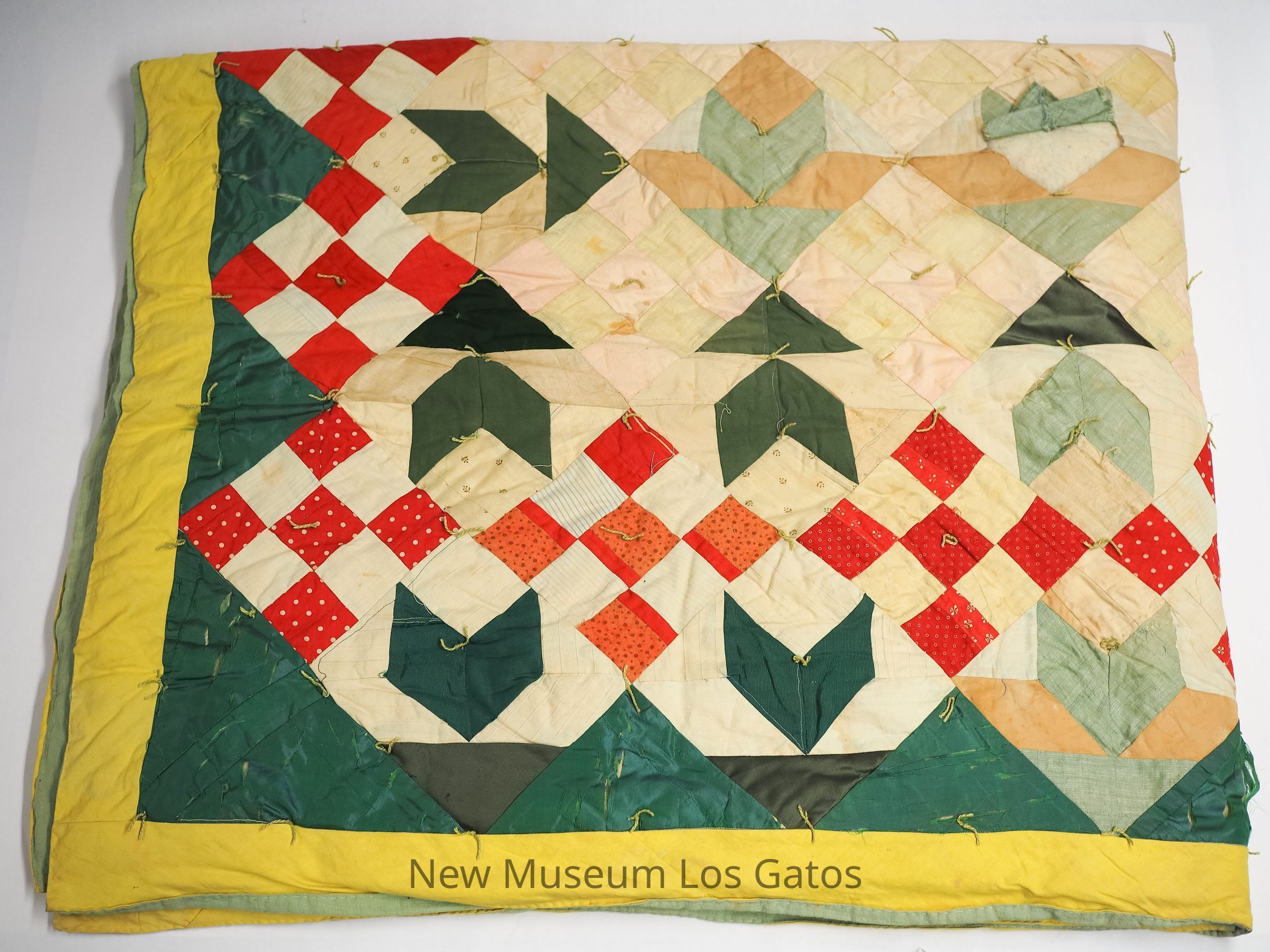 A quilt with light green lining, green, red, pink, and white patches, and a yellow border.Collection