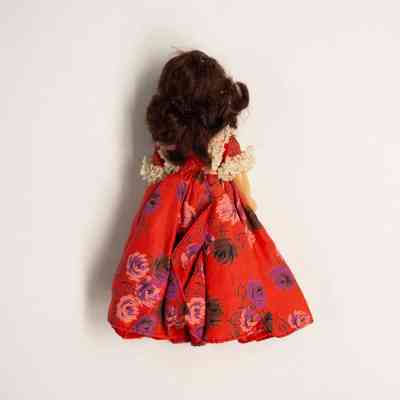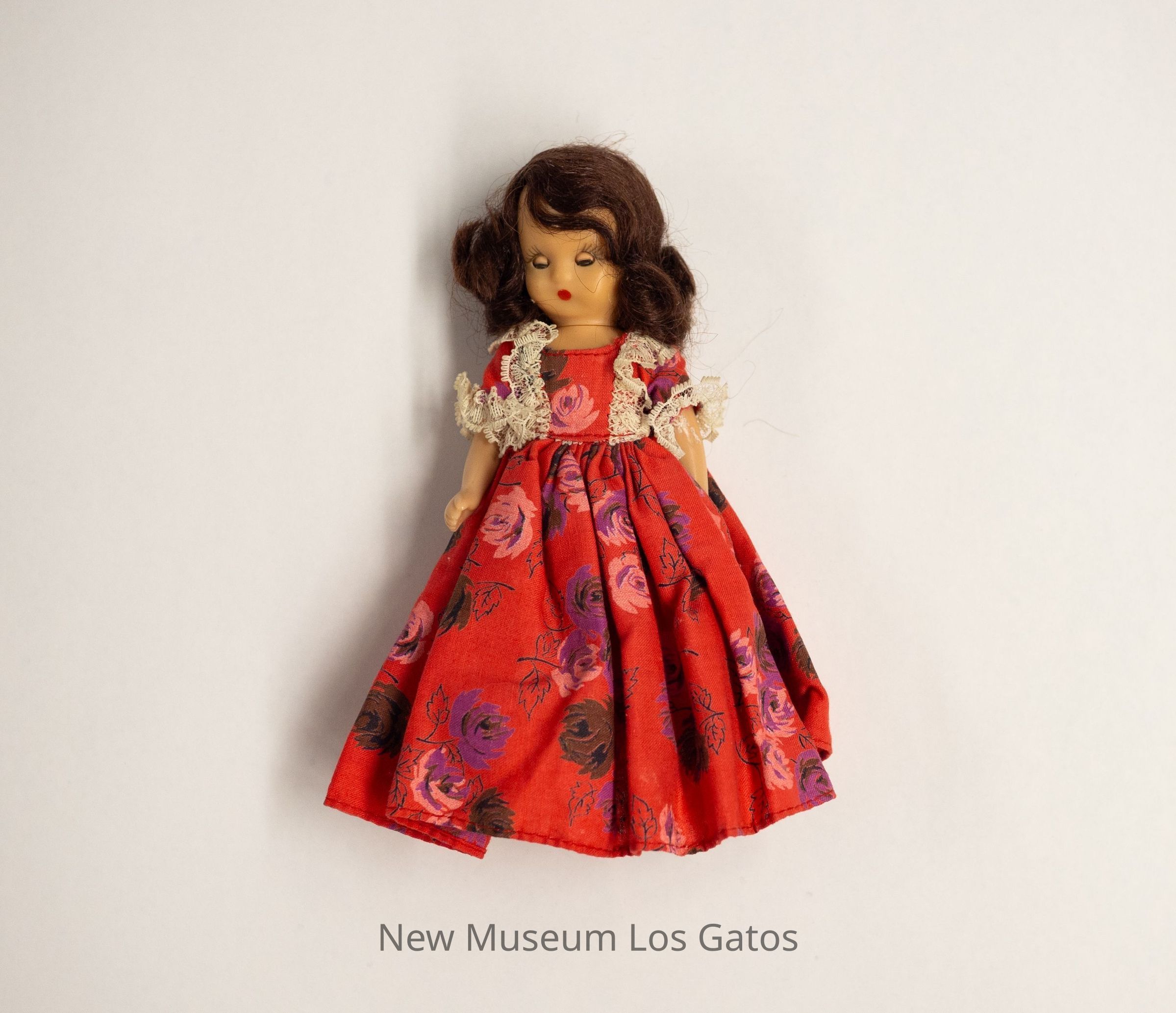 A small, plastic female Nancy Ann Storybook doll. The doll is wearing a red dress with a pink, purple, and brown floral pattern throughout. The dress sleeves are short, and there is white lace trim at the sleeve cuffs and around the bodice. The doll's face is painted on, and her eyes open and close upon raising or lowering the doll. The doll's hair is brown.Collection