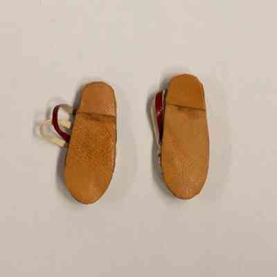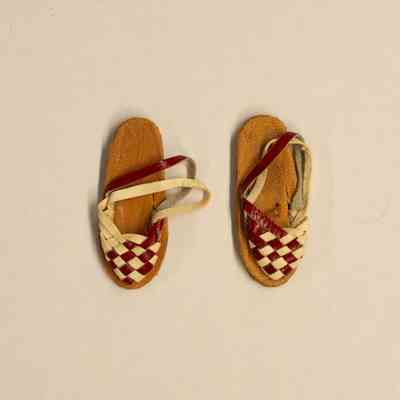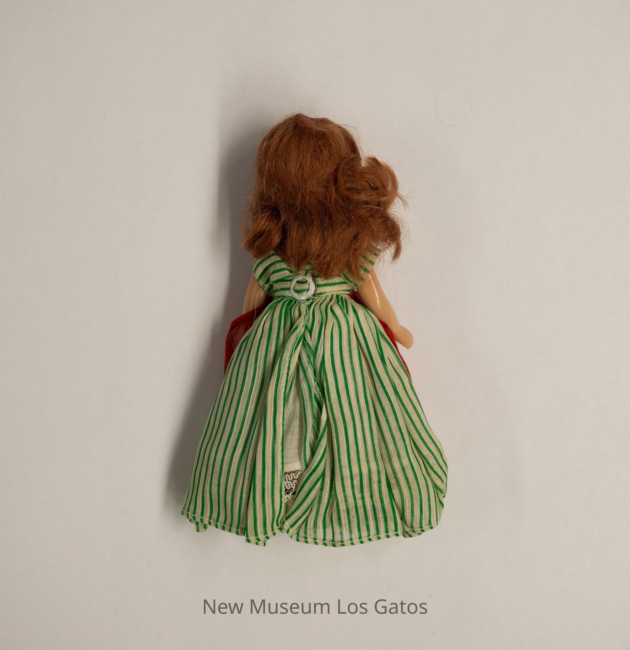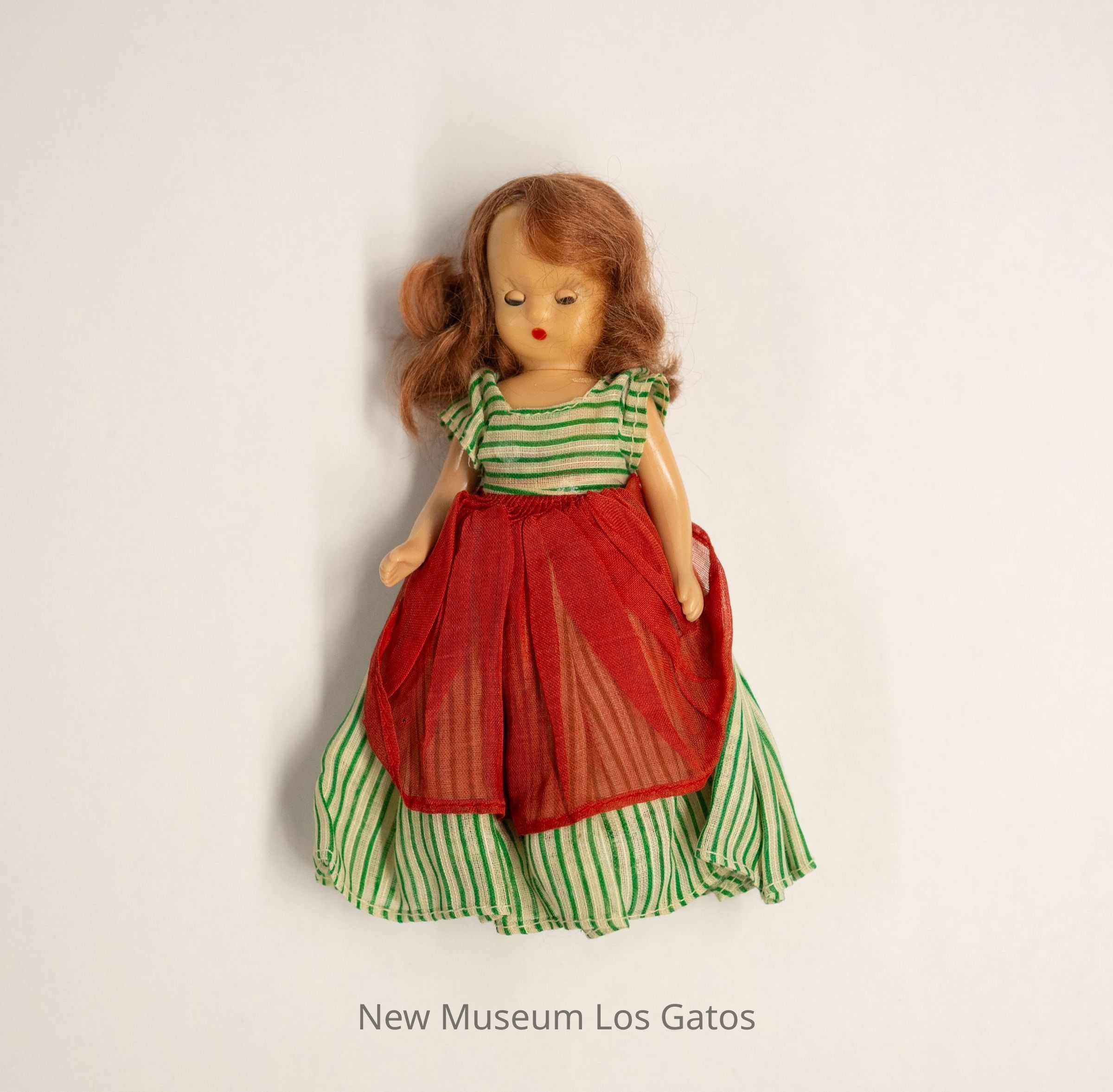 A small, plastic female Nancy Ann Storybook doll. The doll has painted black shoes, and is wearing a green and white striped dress, with a red apron. The doll has long brown hair, and her eyes open and close as the doll is raised and lowered. Accompanying the doll is a pair of detached sandals with a red and white checkered pattern.Collection