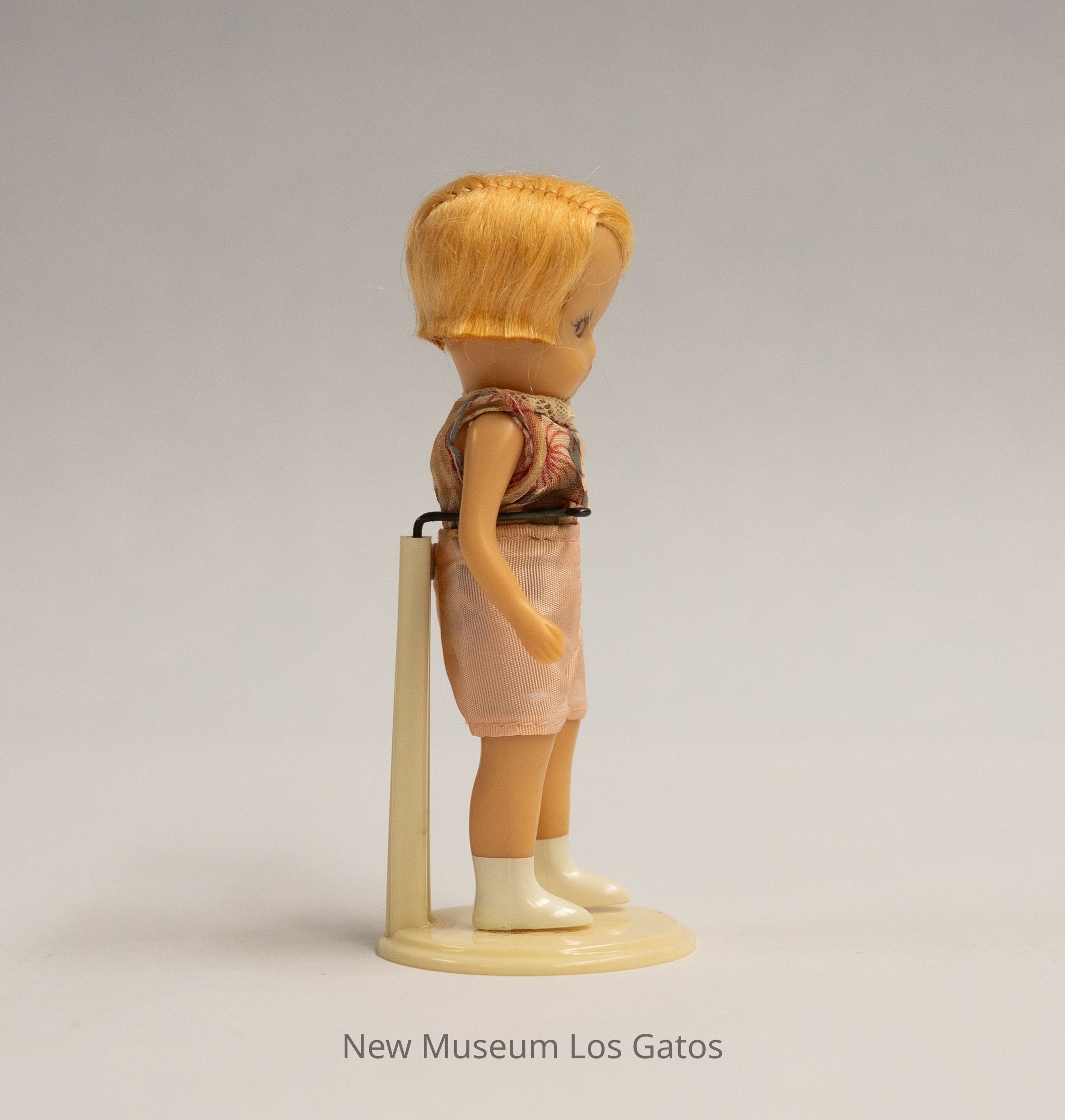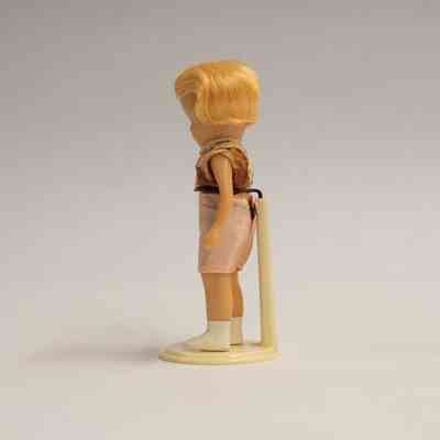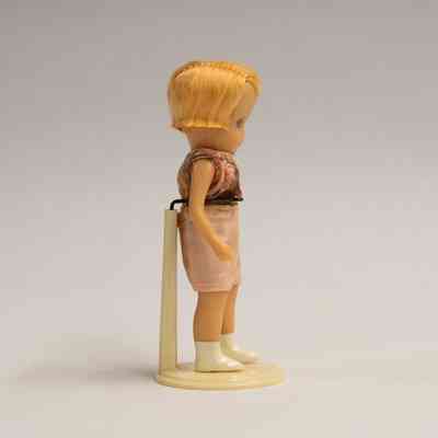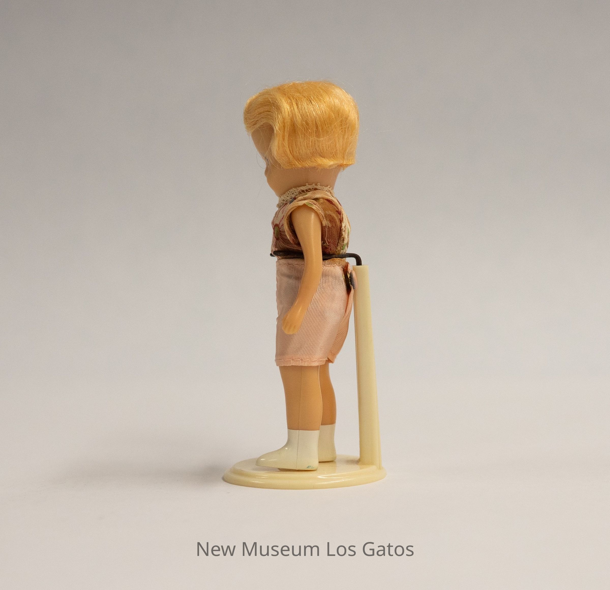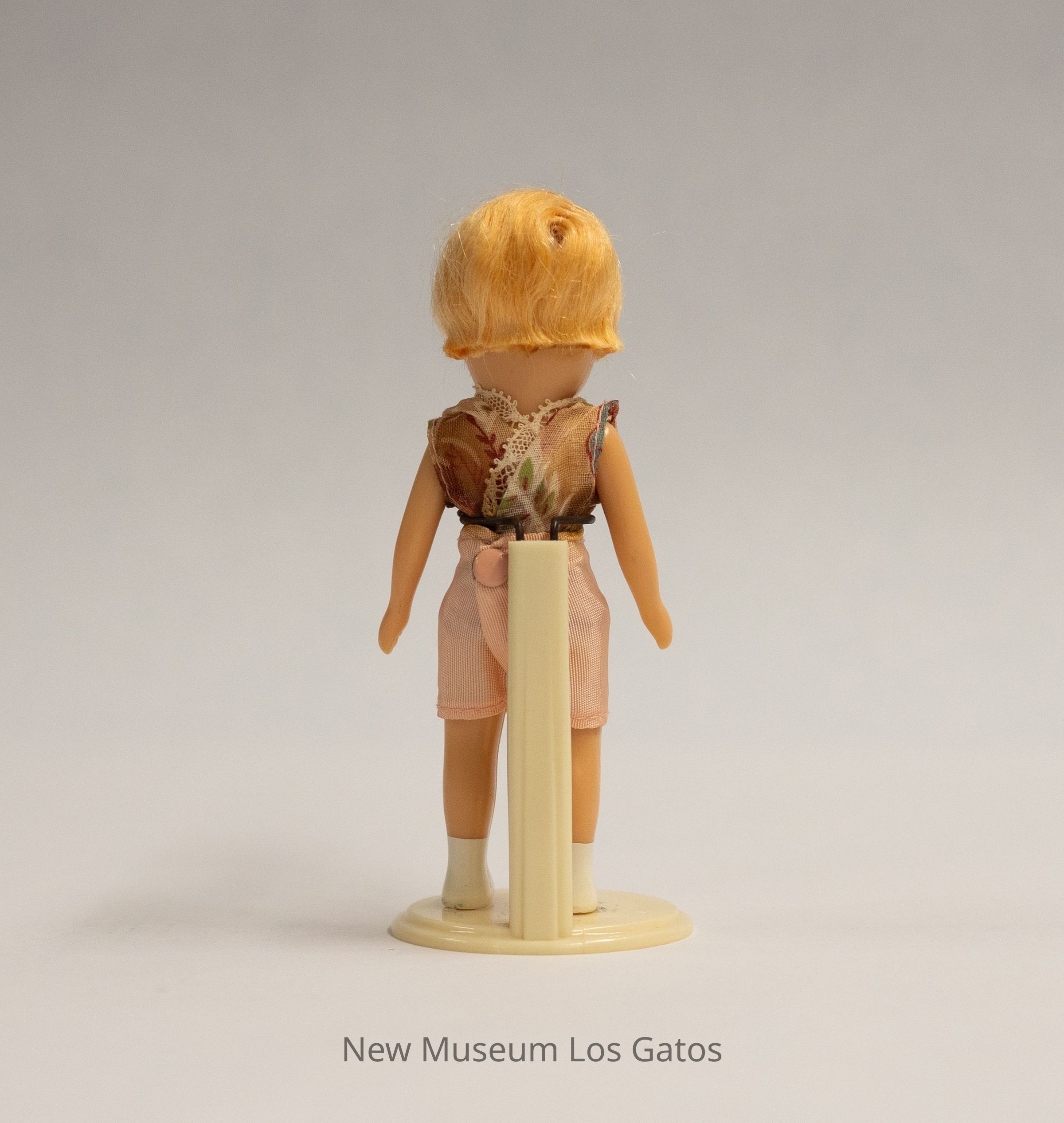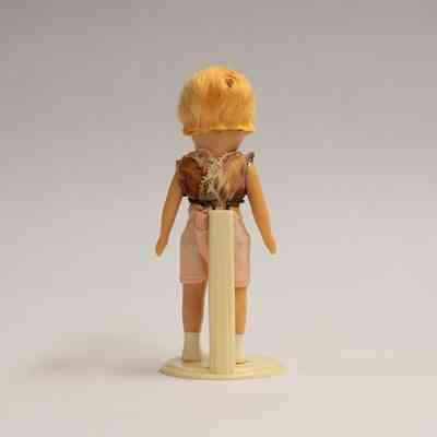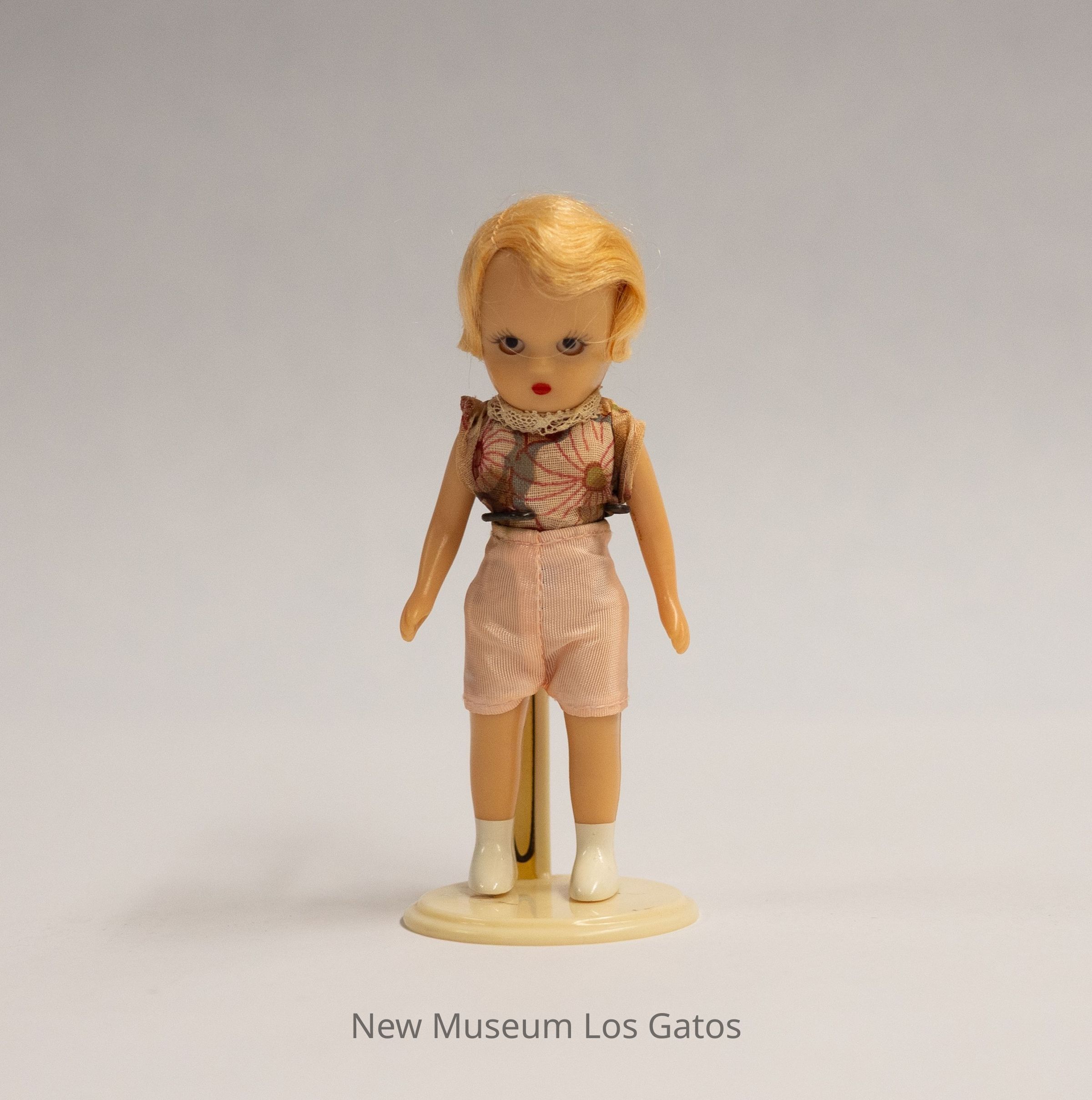 A small, plastic female Nancy Ann Storybook doll. The doll has painted white shoes, and is wearing pink shorts and a floral sleeveless blouse, with lace around the neckline. The doll has short blonde hair and eyes that open and close as the doll is raised and lowered. Accompanying the doll is a white plastic stand with metal prongs to hold the doll.Collection