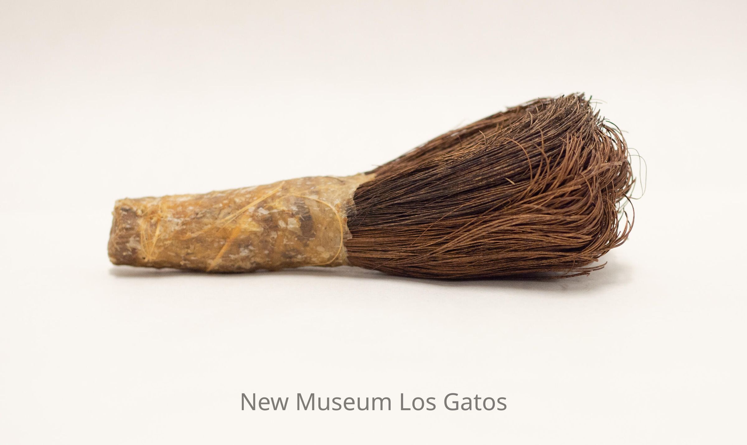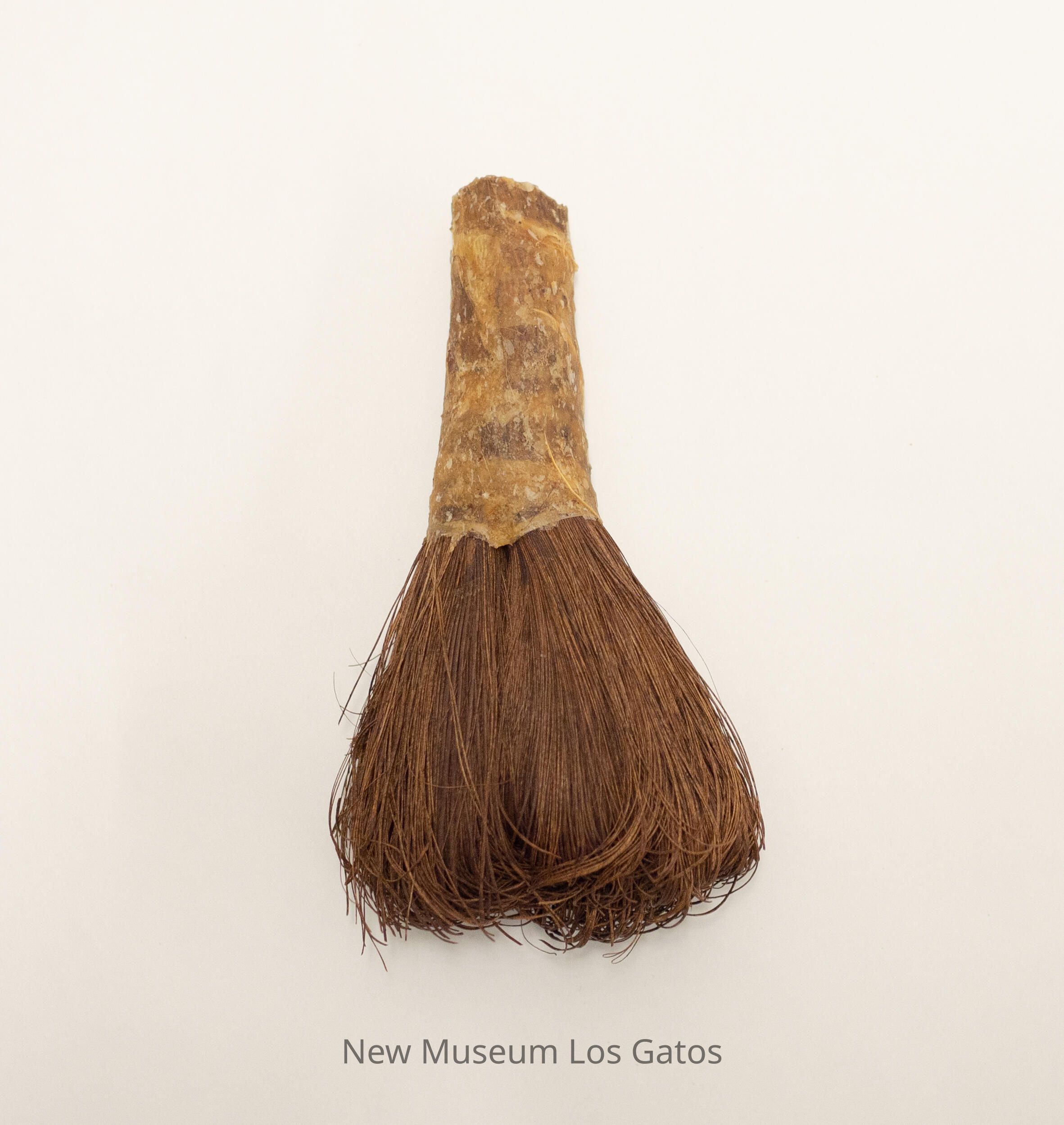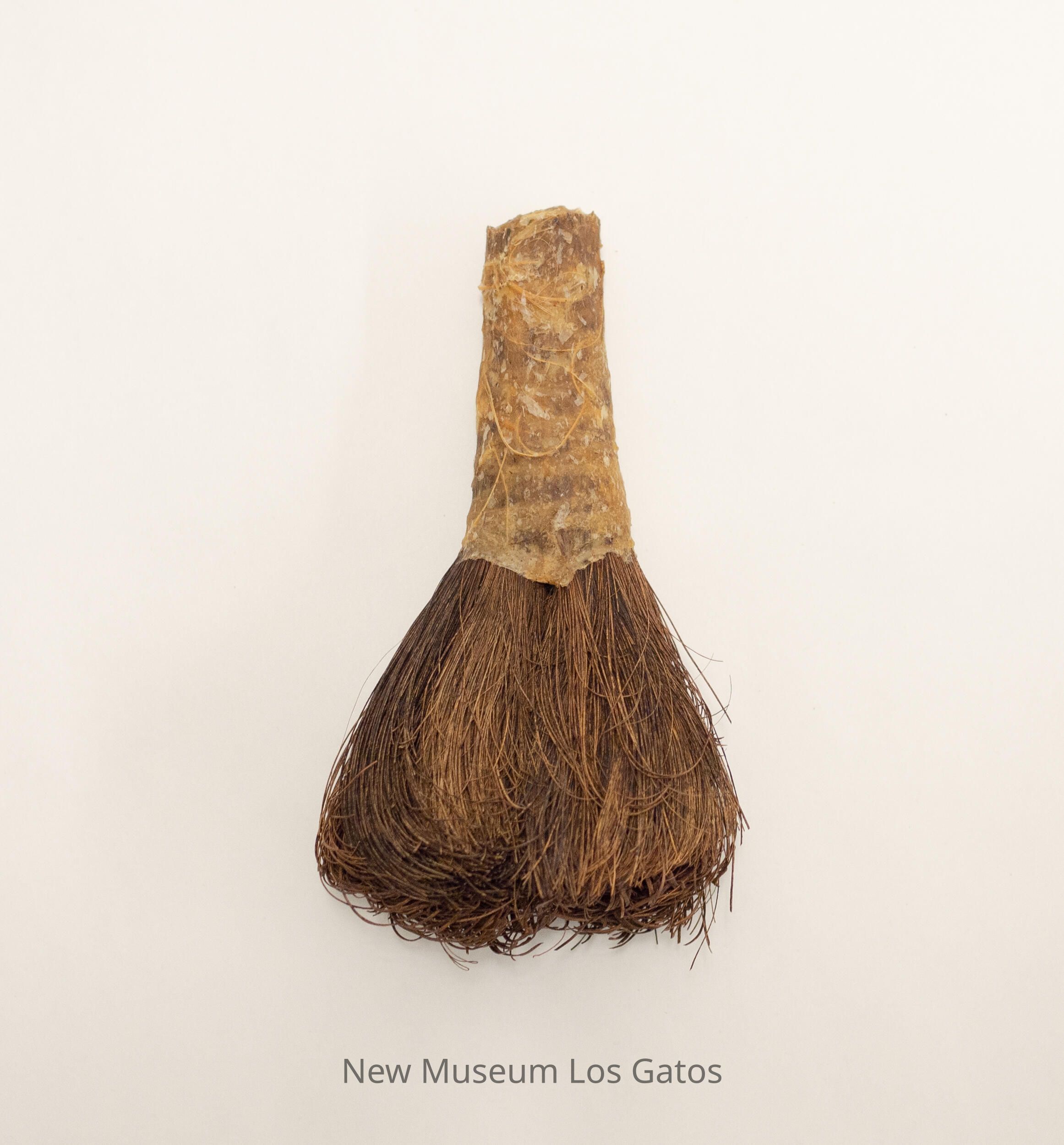 A small brush, made out of natural, dark brown plant fibers. The fibers are attached to short wooden handle and adhered with a natural wax/resin.Collection
