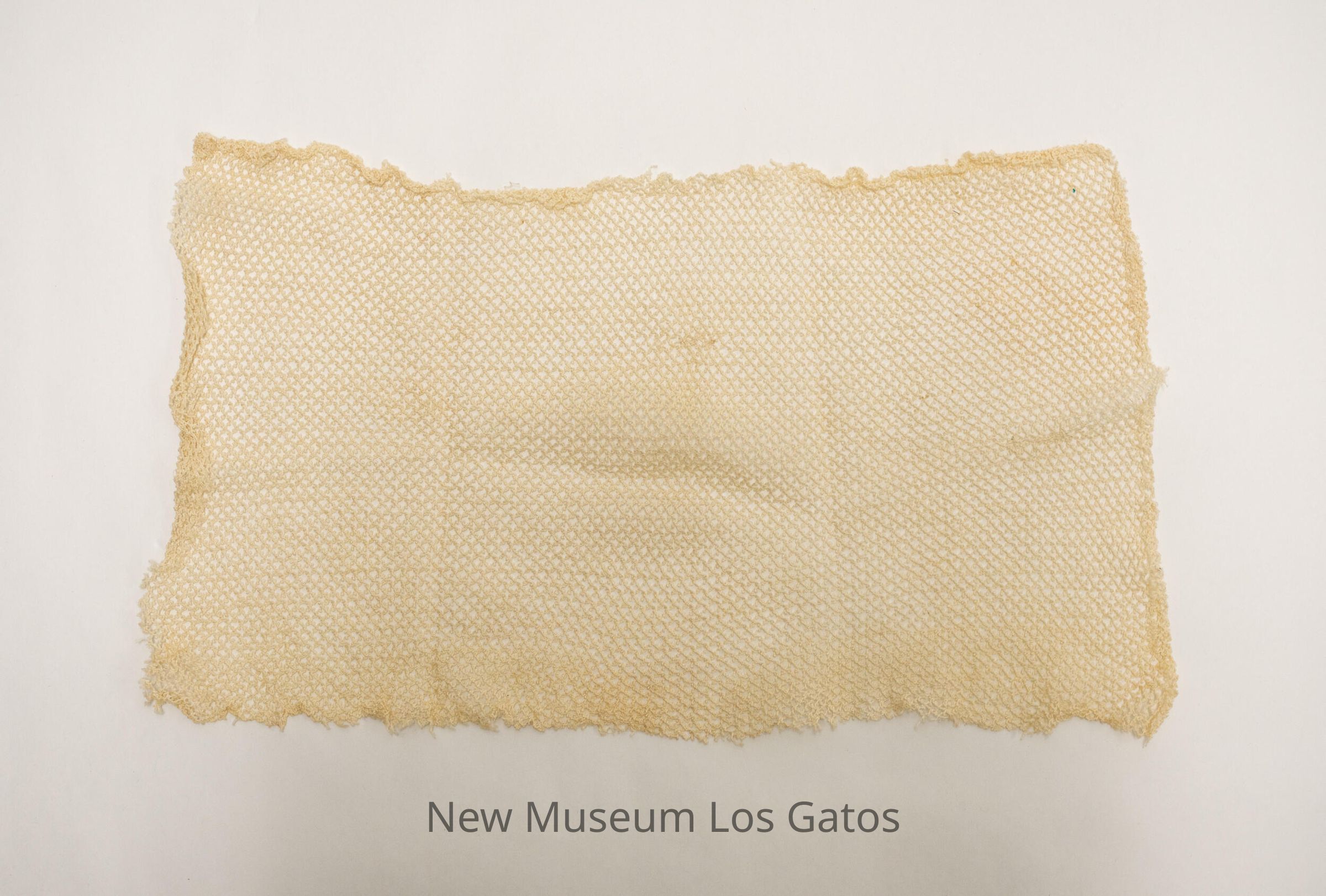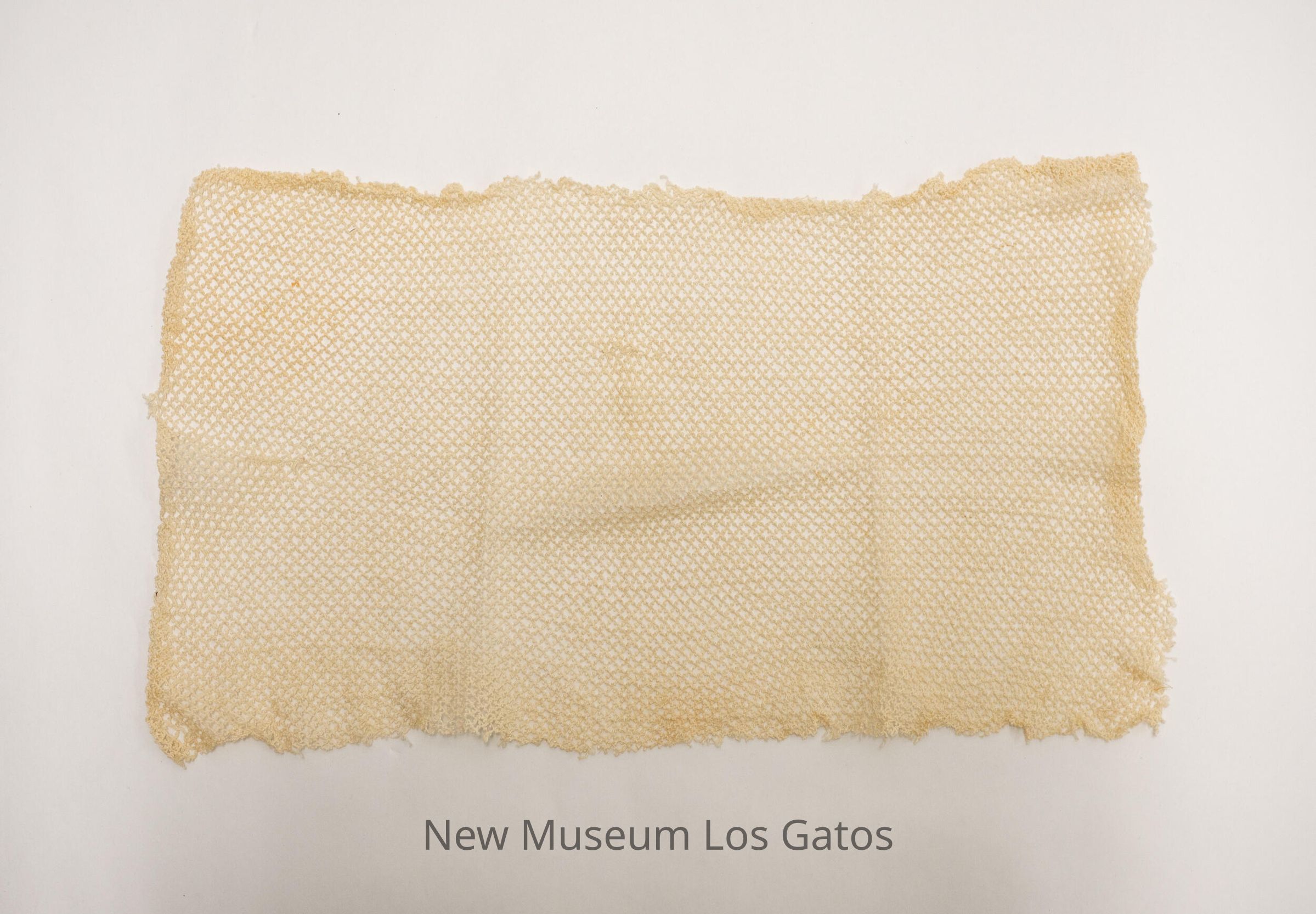 A rectangular, cream-colored netted doily. The holes in the doily are diamond-shaped, and arranged in a consistent pattern.Collection