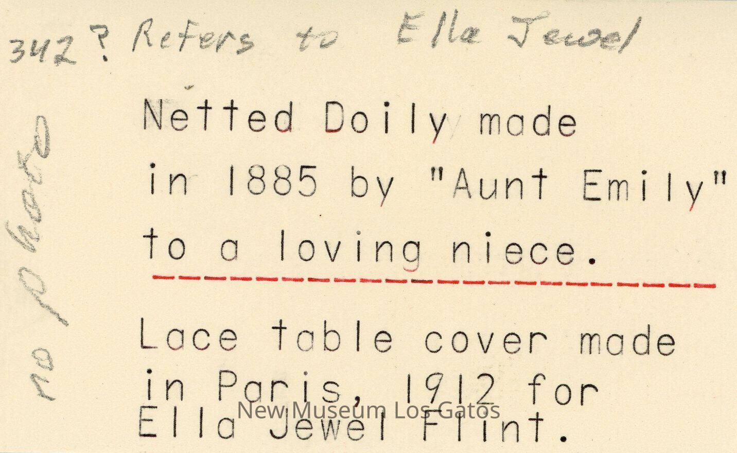 Note accompanying the doily states that it was made in 1885 by "Aunt Emily" for a beloved niece.Lexicon