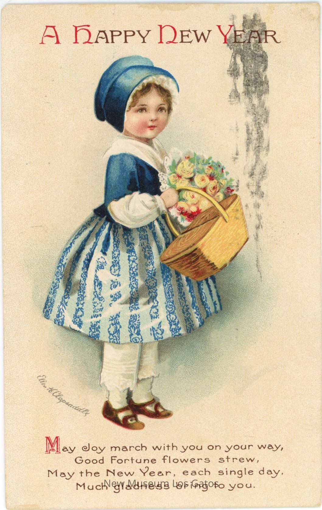 A postcard featuring a color illustration of a young girl wearing a blue bonnet, a dress with a solid blue top and blue-and-white striped skirt, and brown shoes. The girl is holding a brown basket and a bouquet of flowers. The postcard has been mailed, and includes an addressee, a stamp, and a message written in pen.Collection