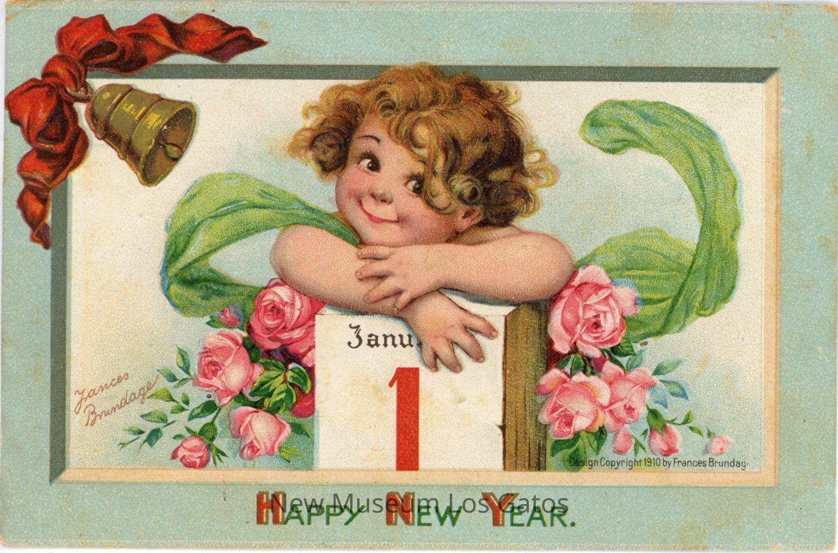 A postcard featuring a color illustration of a young child behind a block that says 'January 1,' surrounded by pink roses. This illustration is inside of a light blue border with a bell and red ribbon in the upper left corner. The postcard has been mailed, and includes an addressee, a stamp, and a message written in pencil.Collection