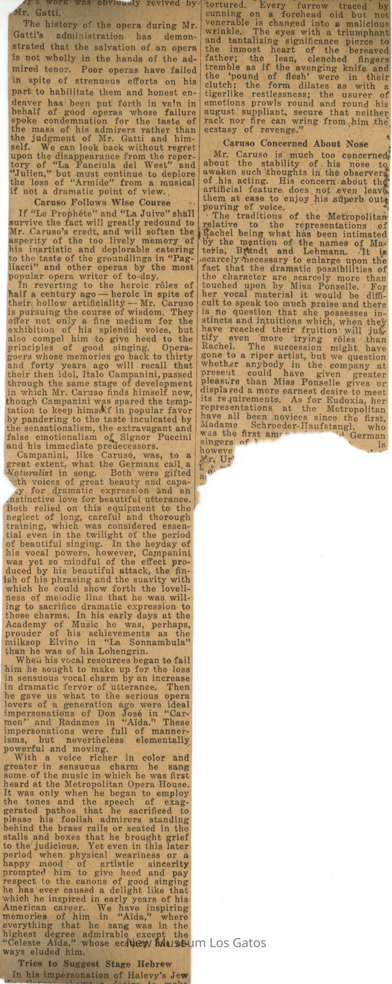 Small clipping from the New-York Tribune, on December 5th, 1919. The article contains a review of "La Juive," preformed by the Metropolitan Opera in 1919, revived by Enrico Caruso.Collection