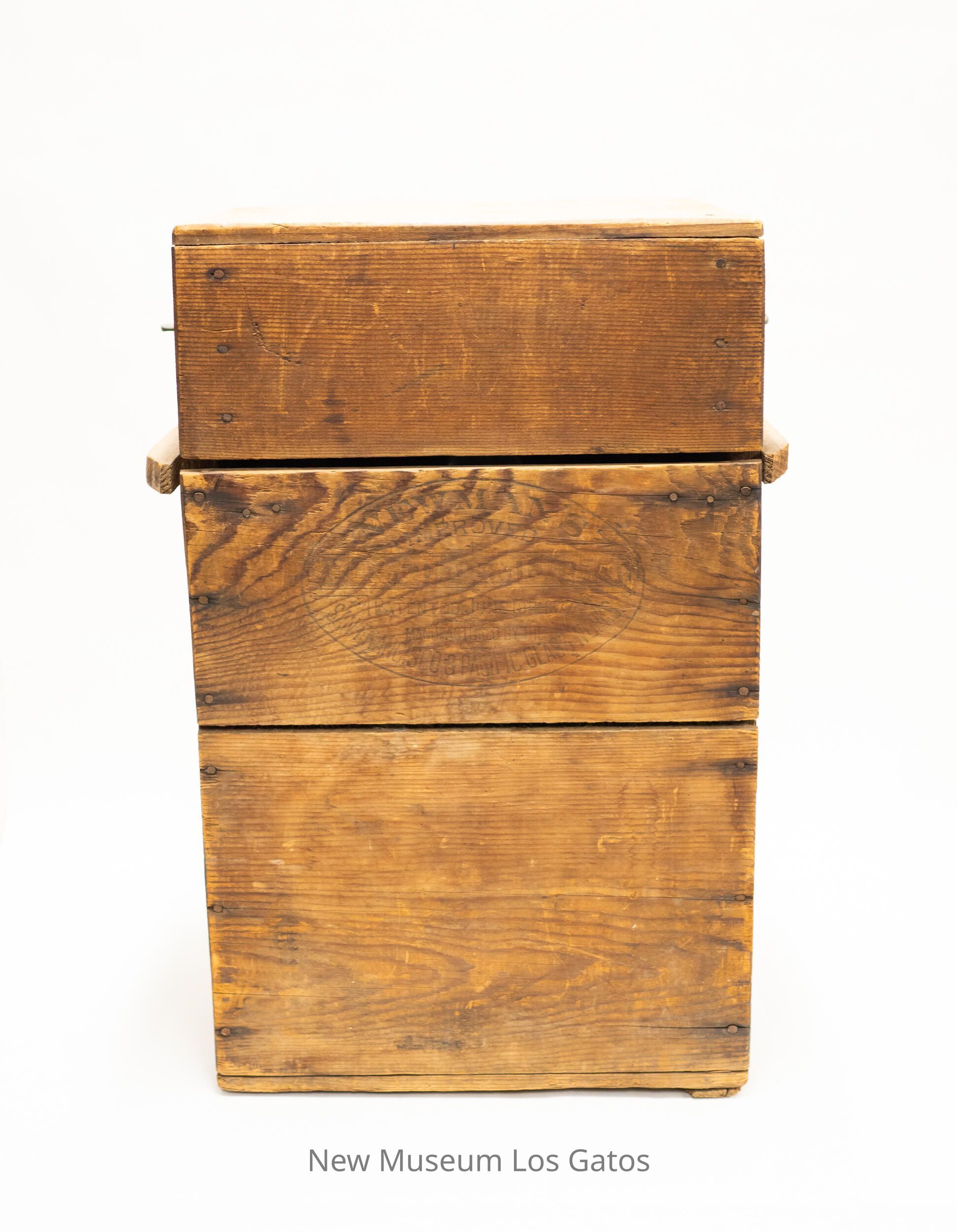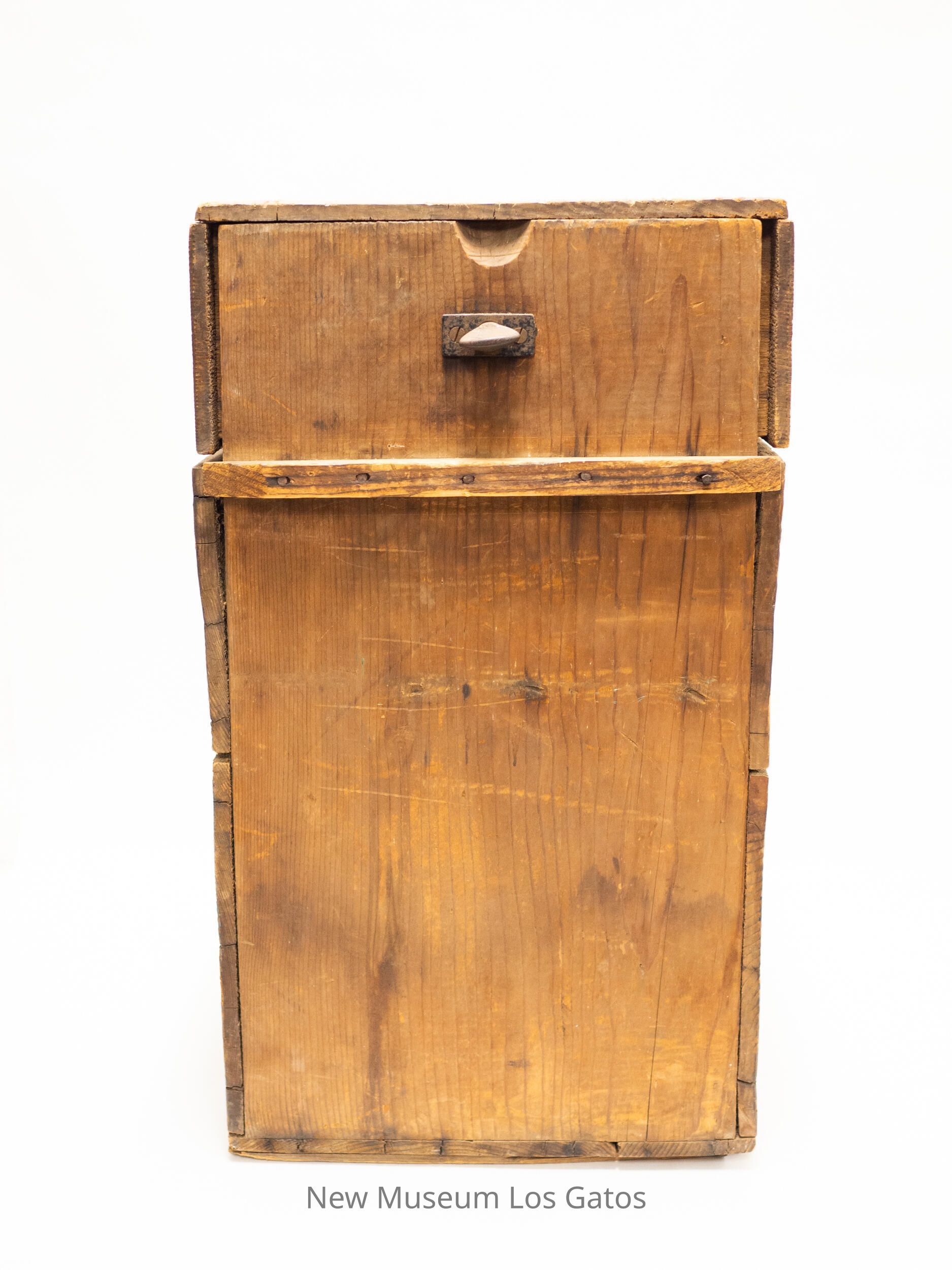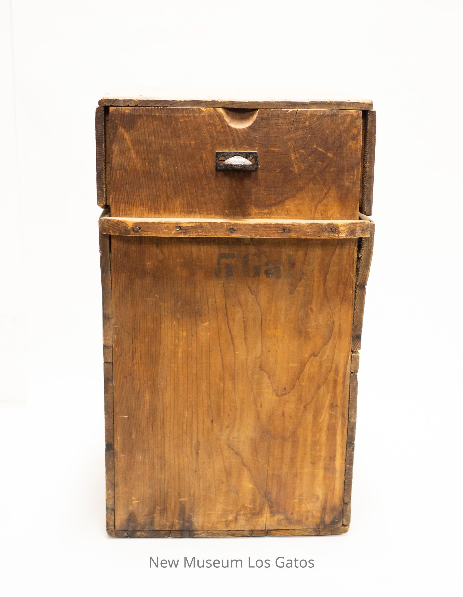 Tag reads: "Water bottle - With wooden box, brown strap, brown jug. The box would be stuffed with anything handy and absorbent; soaked with water, it would keep the contents cool, like a modern thermos.