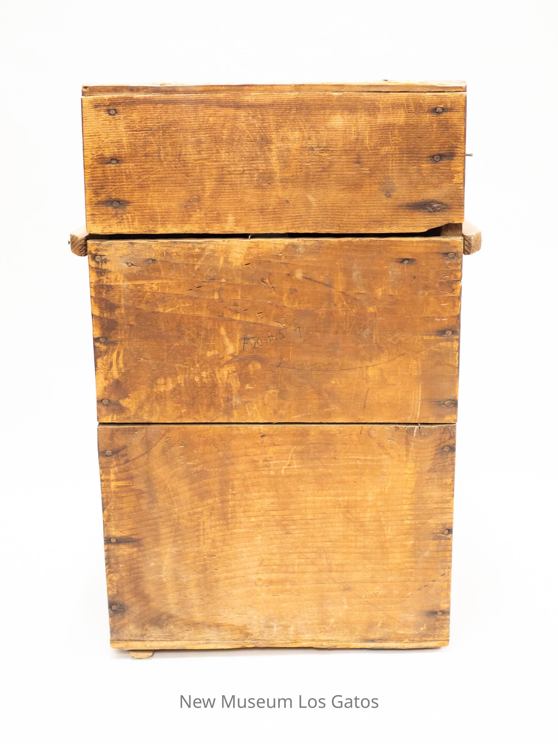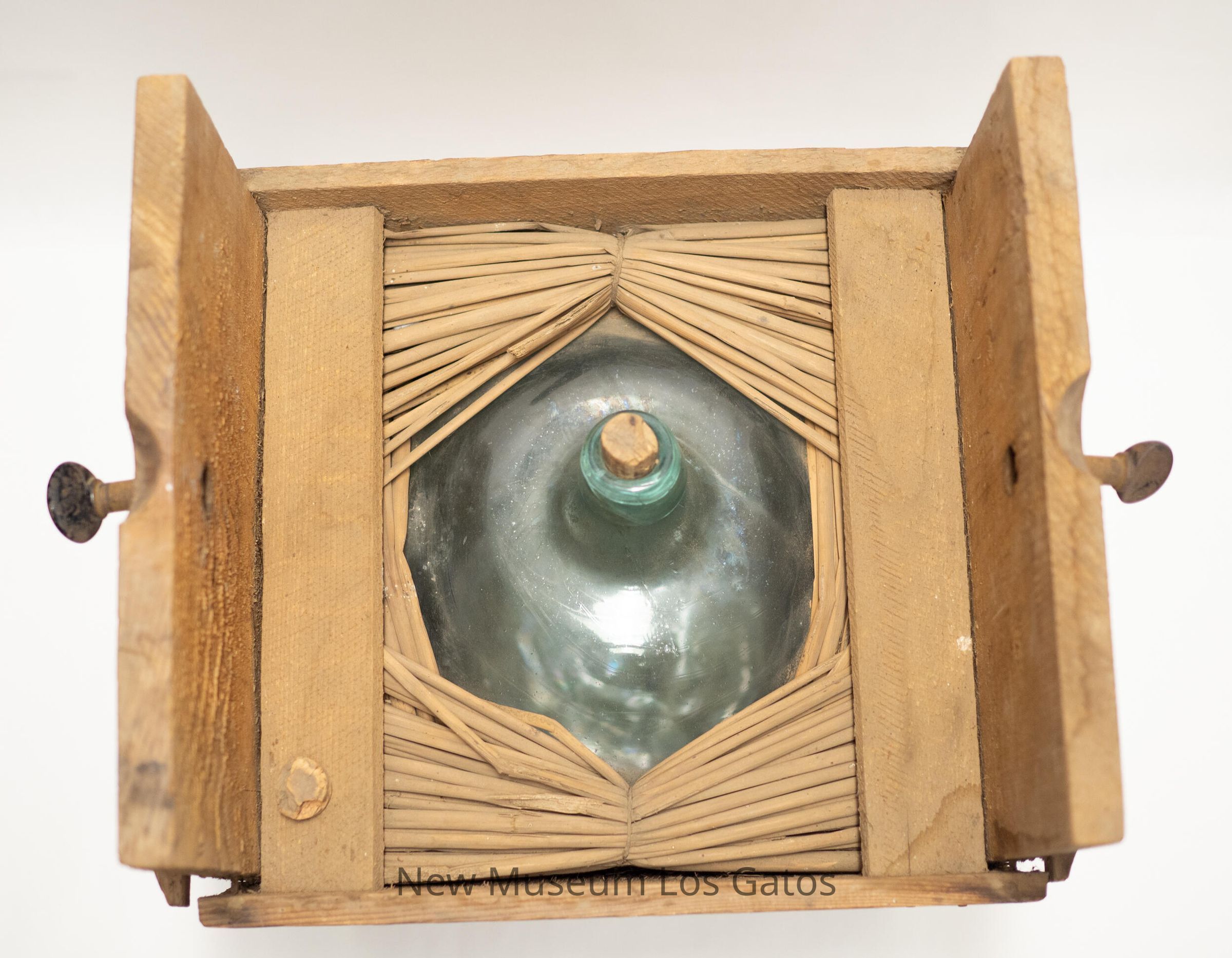 A large, light green/blue colored jug inside a wooden box. There are two metal screws on either side of the top of the box, that hold the lid in place. Inside the box, the jug is surrounded by thinly-rolled paper/plant fibers.Collection