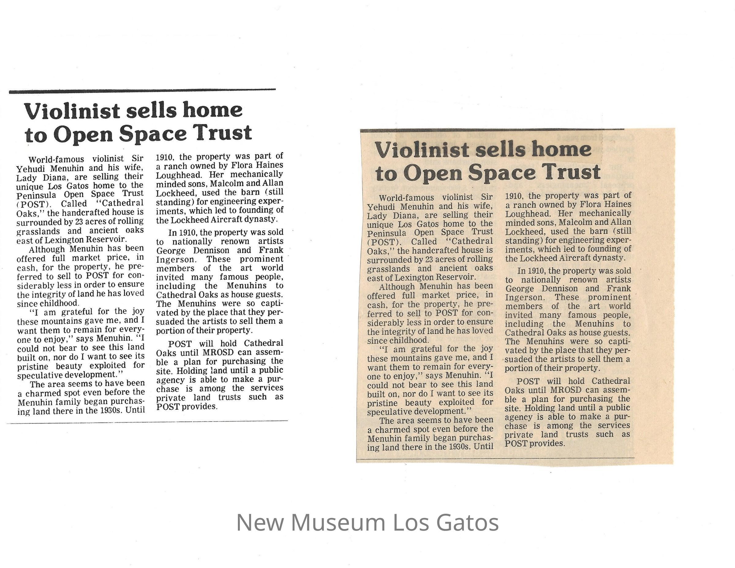Newspaper clipping from an unknown newspaper, discussing Yehudi Menuhin selling Cathedral Oaks to the Peninsula Open Space Trust (POST). Contains the original clipping, taped to a copy of the clipping.Cataloged By