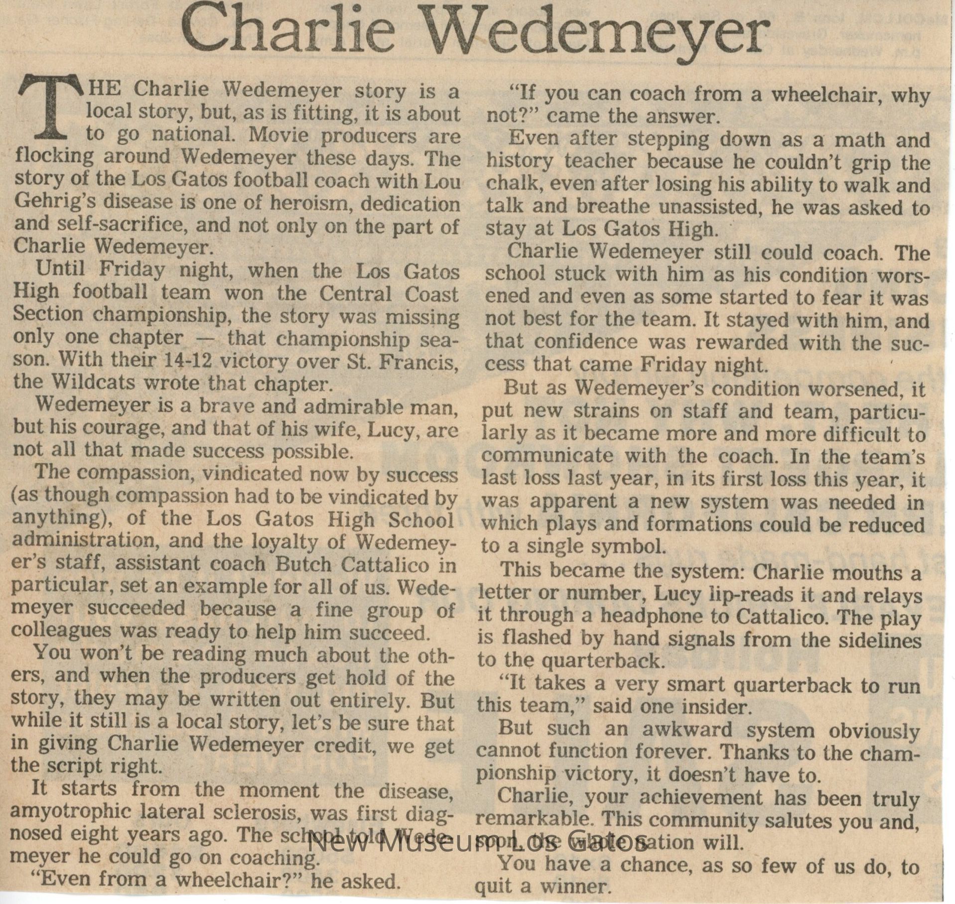 A newspaper clipping, from an unknown publication, about Los Gatos High School football coach Charlie Wedemeyer, and how winning the CCS championship is a fitting end to the story.Collection