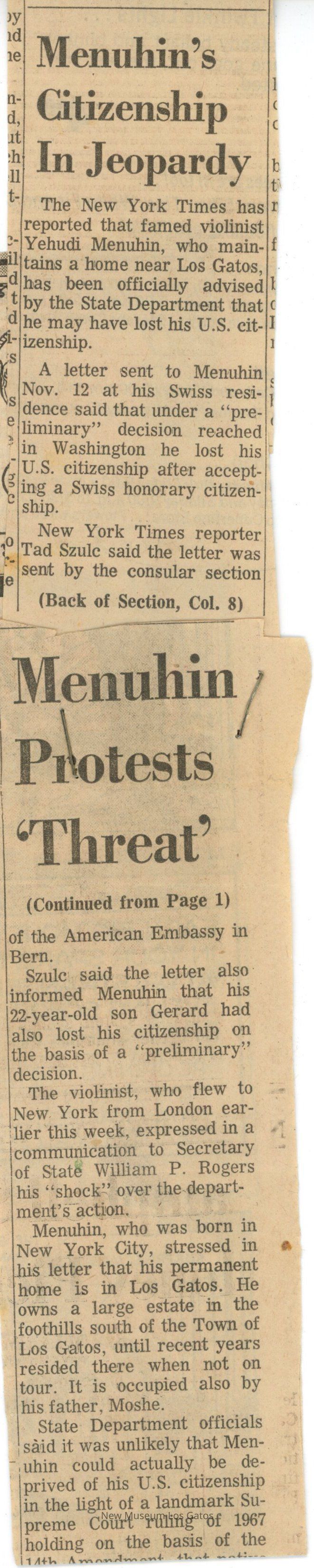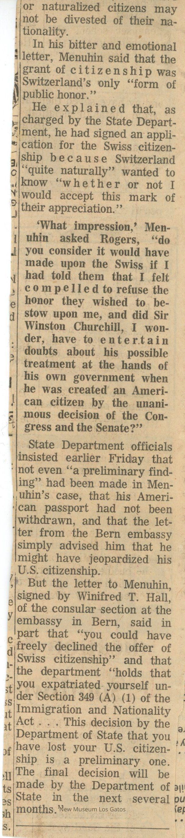Newspaper clipping reporting on Yehudi Menuhin possibly losing his U.S. citizenship. The clipping consists of two parts stapled together.Collection