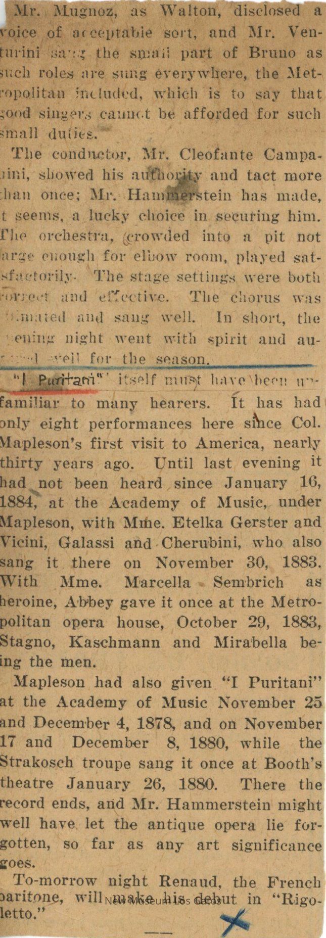 Small newspaper clipping with a review of "I Puritani" at the Metropolitan Opera. The clipping is undated and unattributed. Two clippings have been glued together.