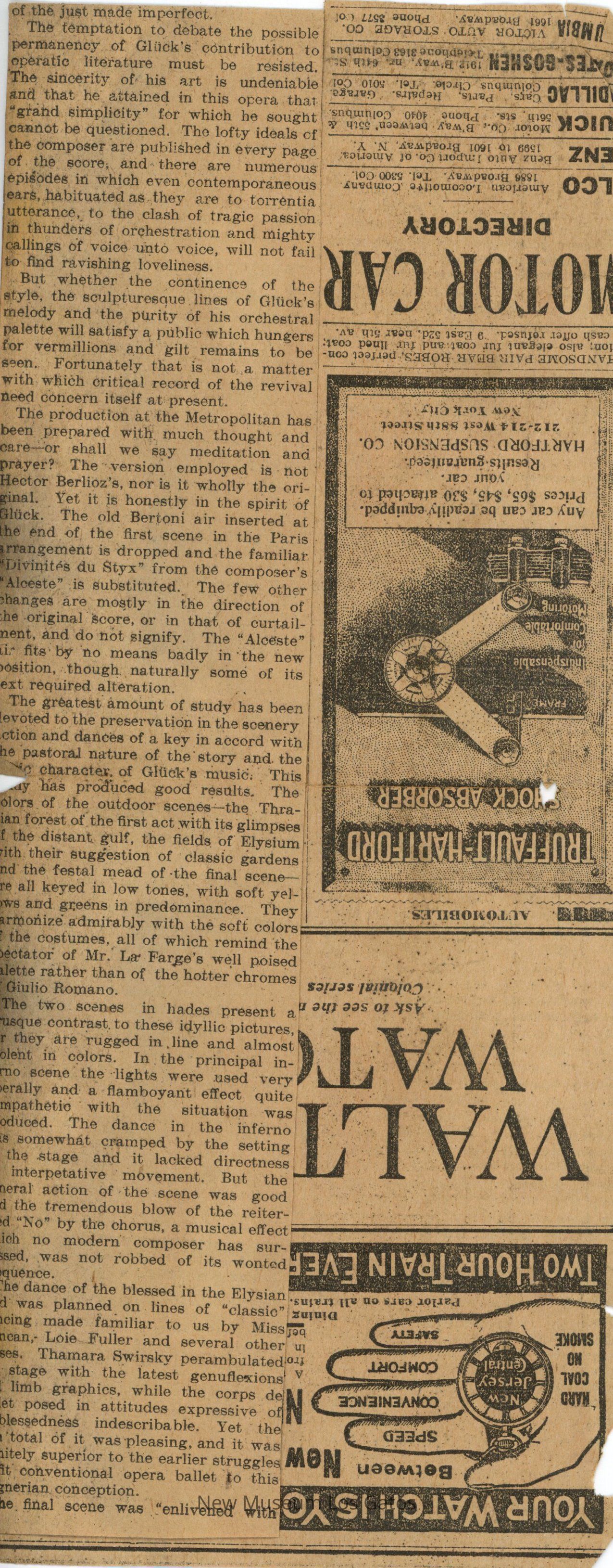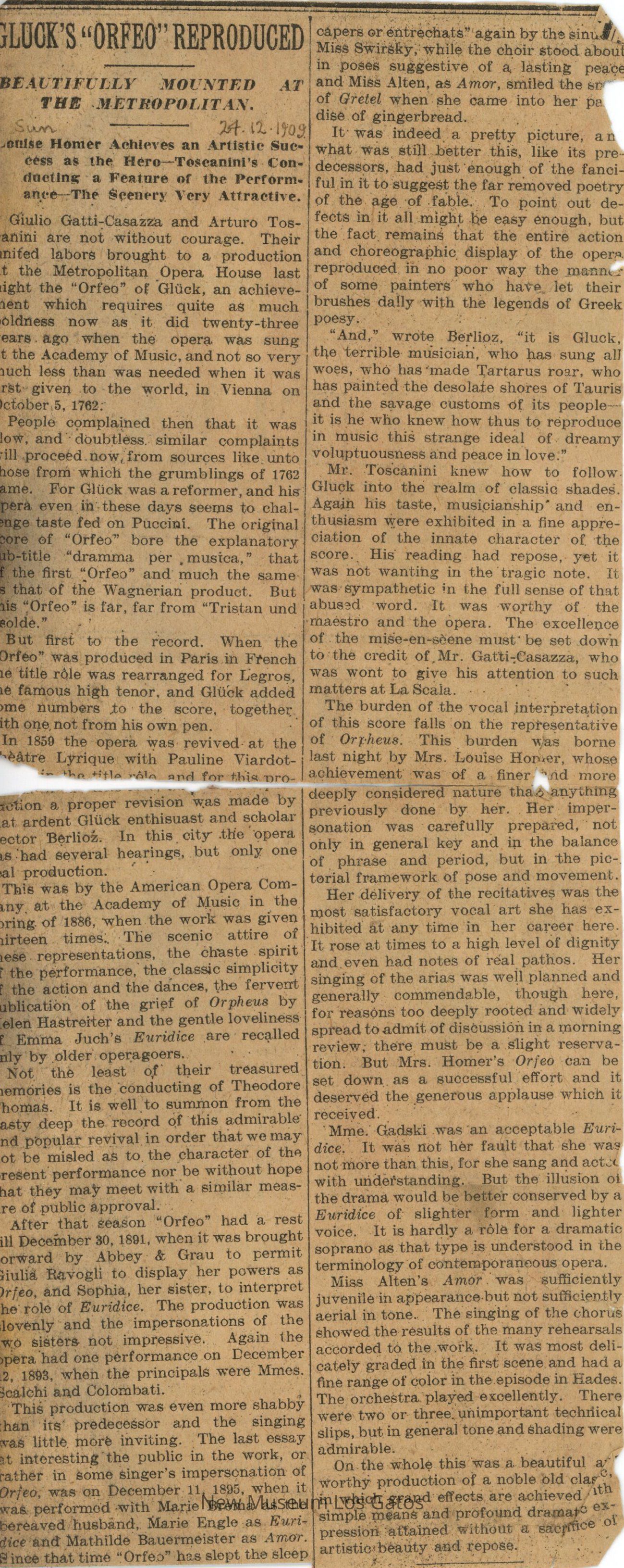 A large newspaper clipping, with review of "Orfeo" at the Metropolitan Opera. The clipping is dated, by inscription, December 24, 1909.Collection