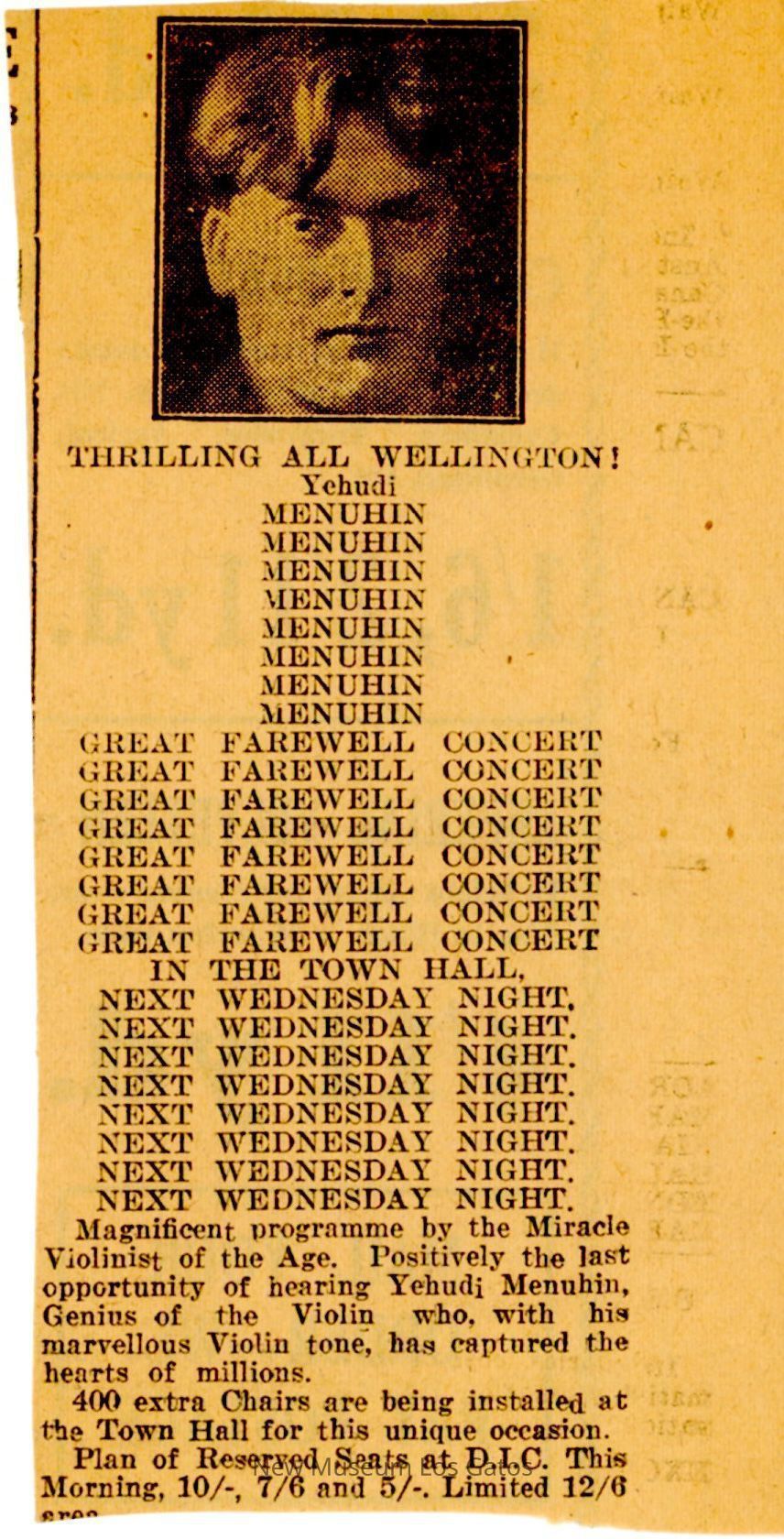 Newspaper clipping from an unknown publication. An advertisement for Yehudi Menuhin's "Great Farewell Concert."Collection
