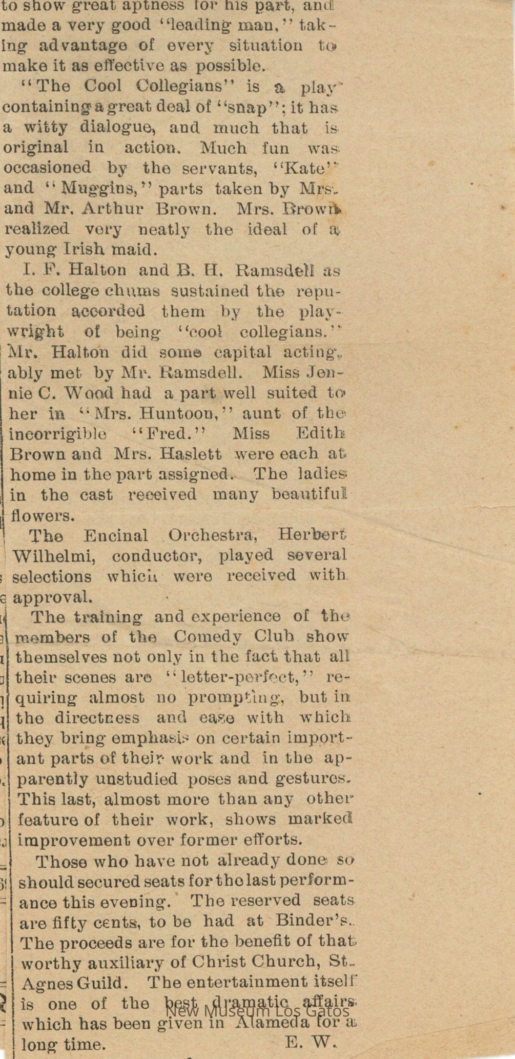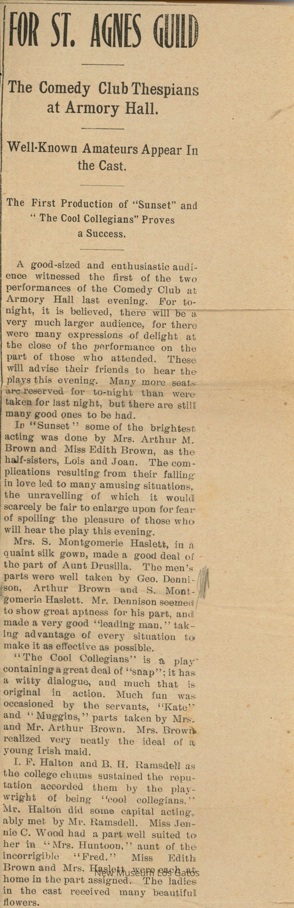 Newspaper clipping with an article reviewing a series of small plays and skits put on by the Comedy Club at the Armory Hall in Alameda, California. The cast includes George Dennison. The plays received positive reviews, and the paper urges readers to purchase a ticket before the show closes.Collection