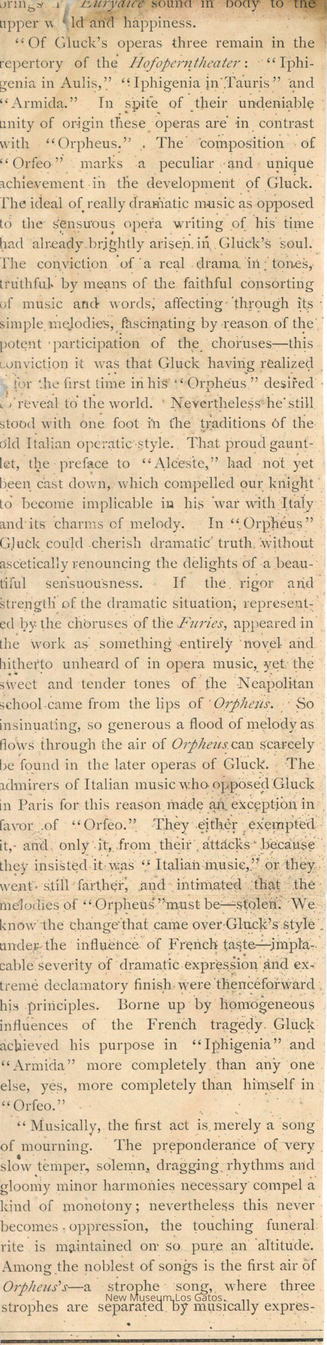 A newspaper clipping with a review of Gluck's "Orpheus" or "Orfeo." The clipping is undated and unattributed. There are advertisements on the reverse side.