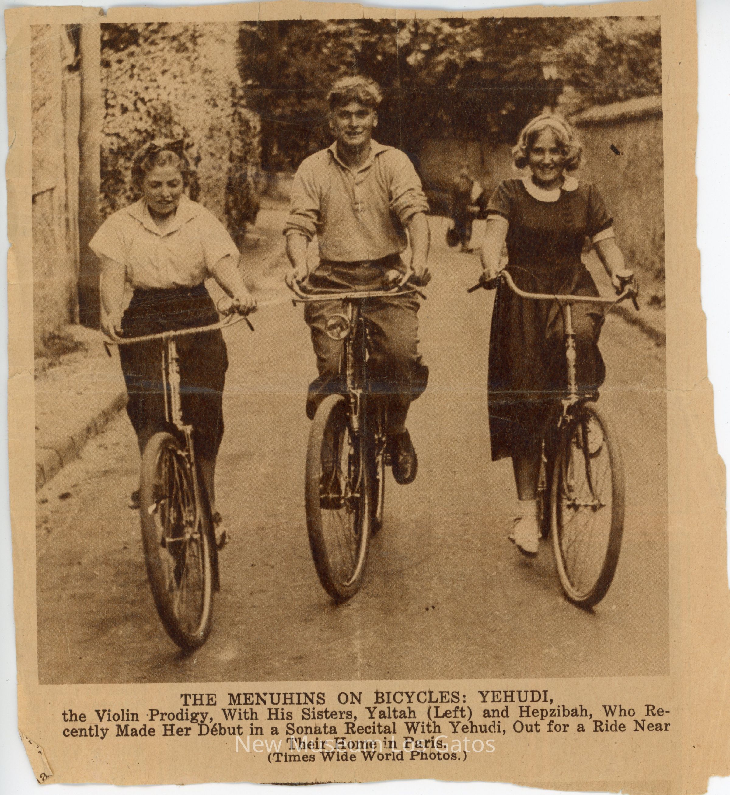 A newspaper clipping about Yehudi, Yaltah, and Hepzibah Menuhin riding their bikes near their home in Paris.Collection