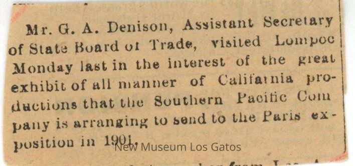 Small newspaper clipping with a small article regarding Geoerge Dennison, Assistant Secretary of the State Board of Trade, being sent to Lompoc to review the California-made products being sent to the Paris Exposition in 1901.Collection