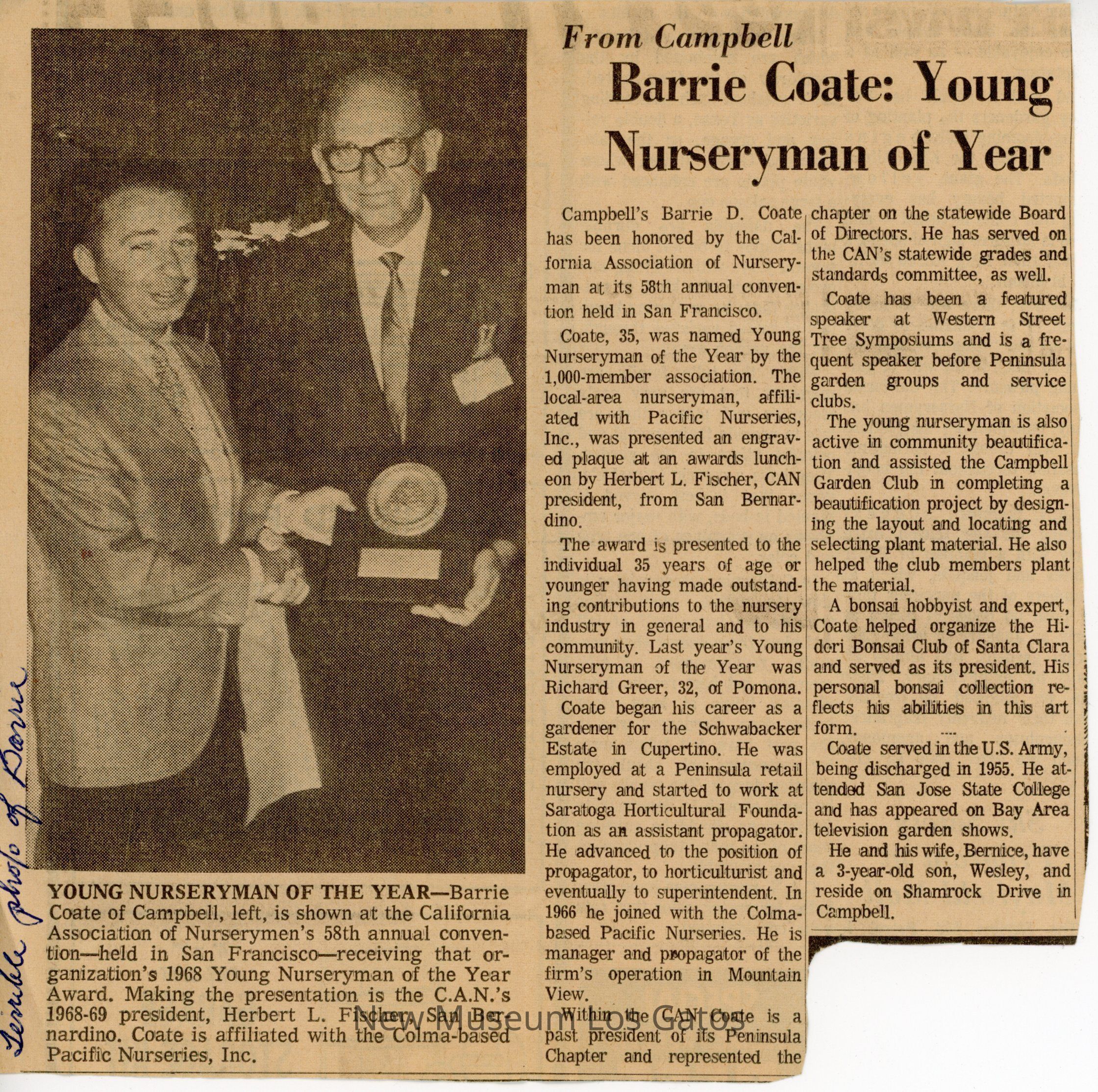 Newspaper clipping of Barrie D. Coate named "Young Nurseryman of the Year" by the California Association of Nurserymen at the 58th annual convention in San Francisco.Collection