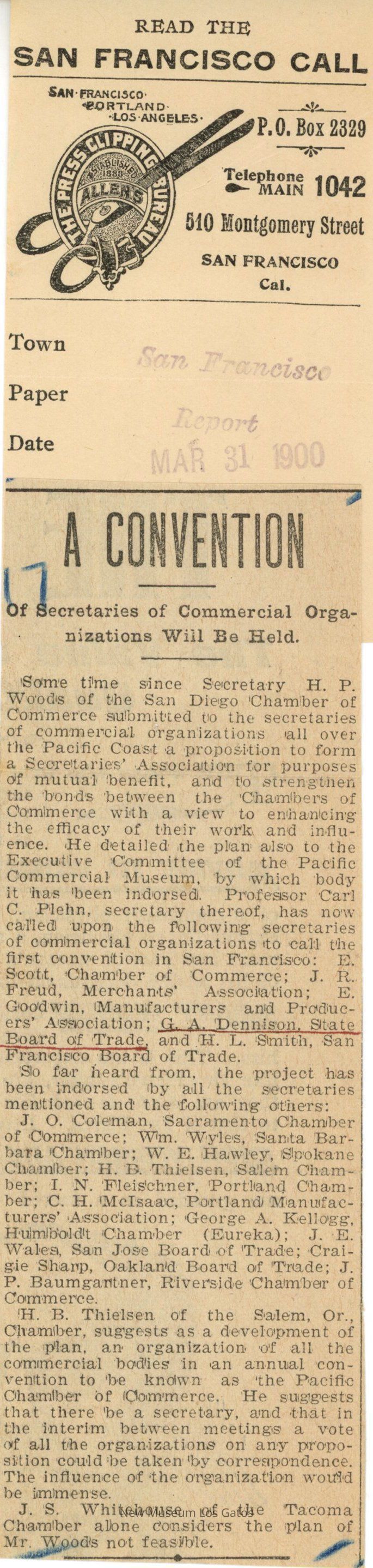 Small newspaper clipping with an attached label card. The clipped article regards a convention of Secretaries of Trade and Commercial Associations to be held in San Francisco.Collection