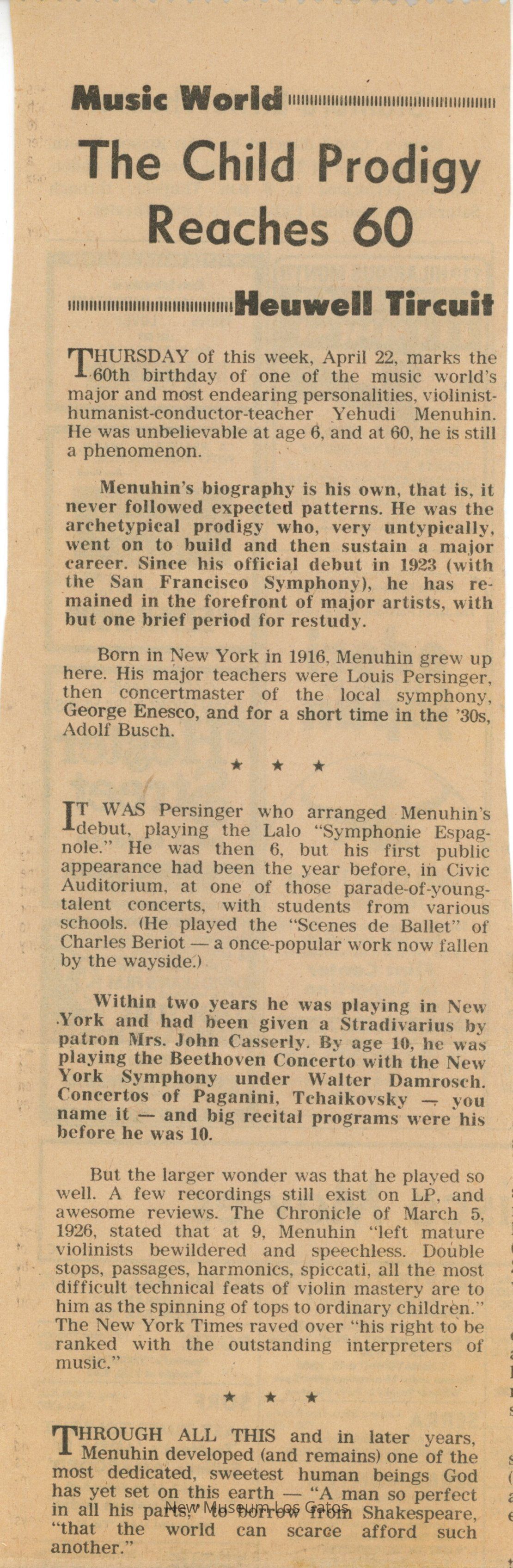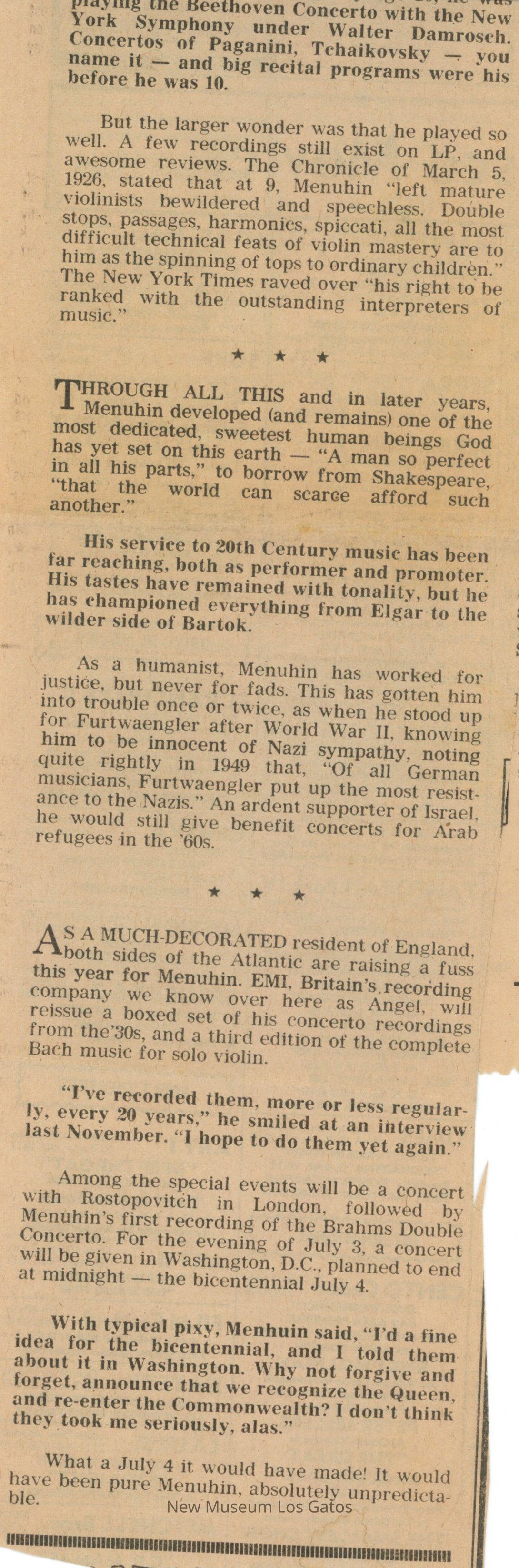 Newspaper clipping, from an unknown paper, with an article about Yehudi Menuhin's 60th birthday, on April 22, 1976.Collection