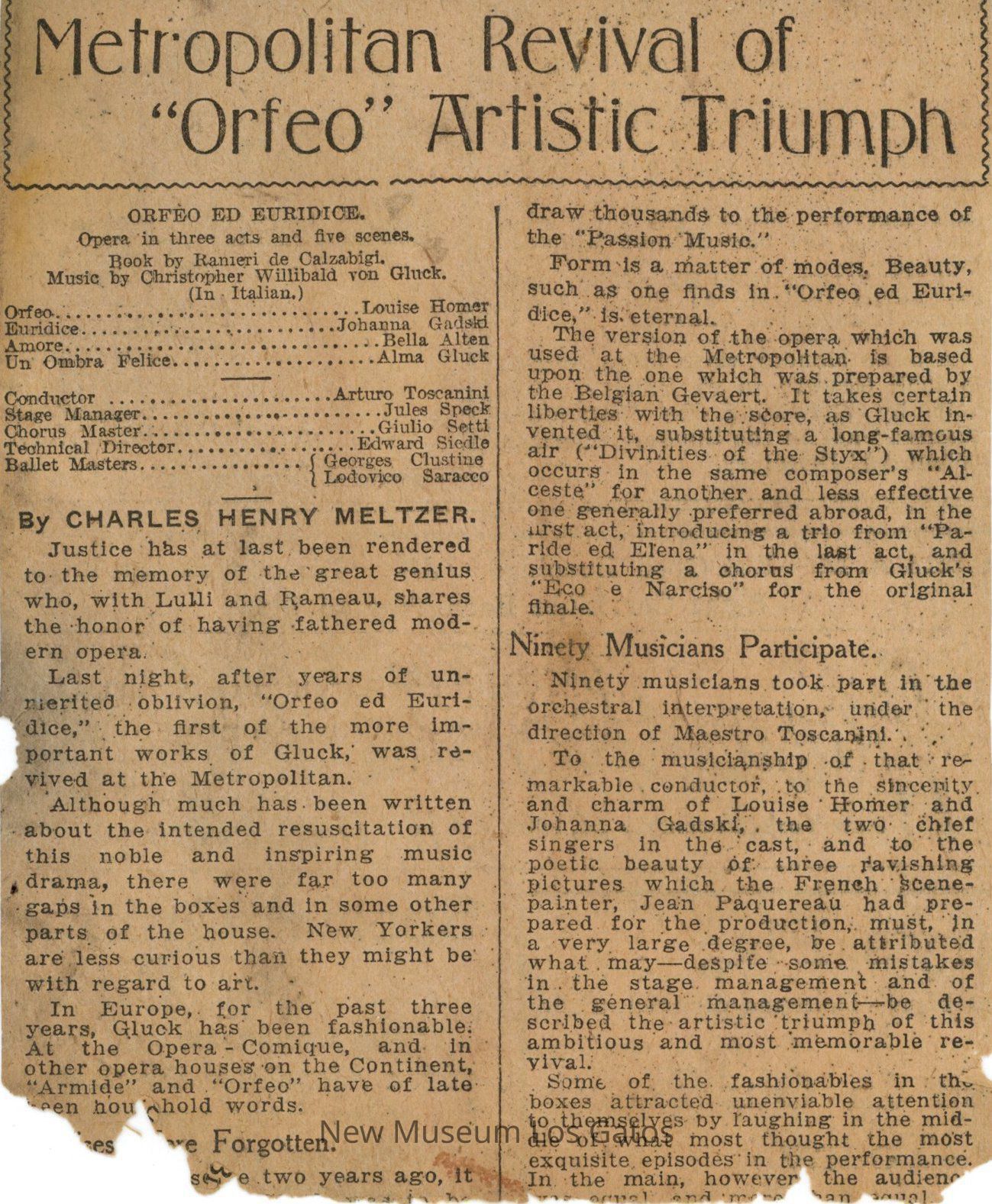 A small newspaper clipping with a review of "Orfeo ed Euridice" presented by the Metropolitan Opera House in New York City. The clipping is undated and unattributed.Collection