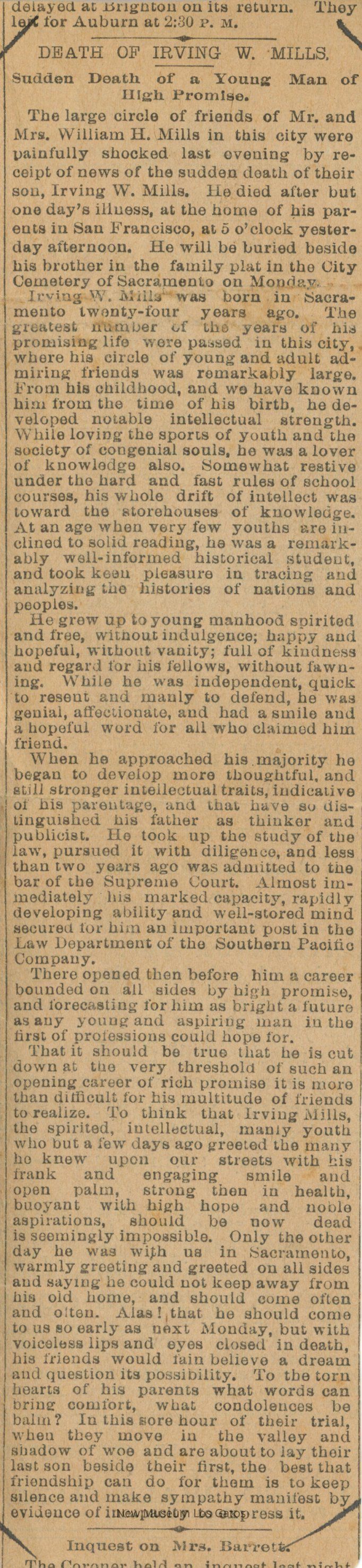 A newspaper clipping with an obituary for Irving W. Mills, in 1895.Collection