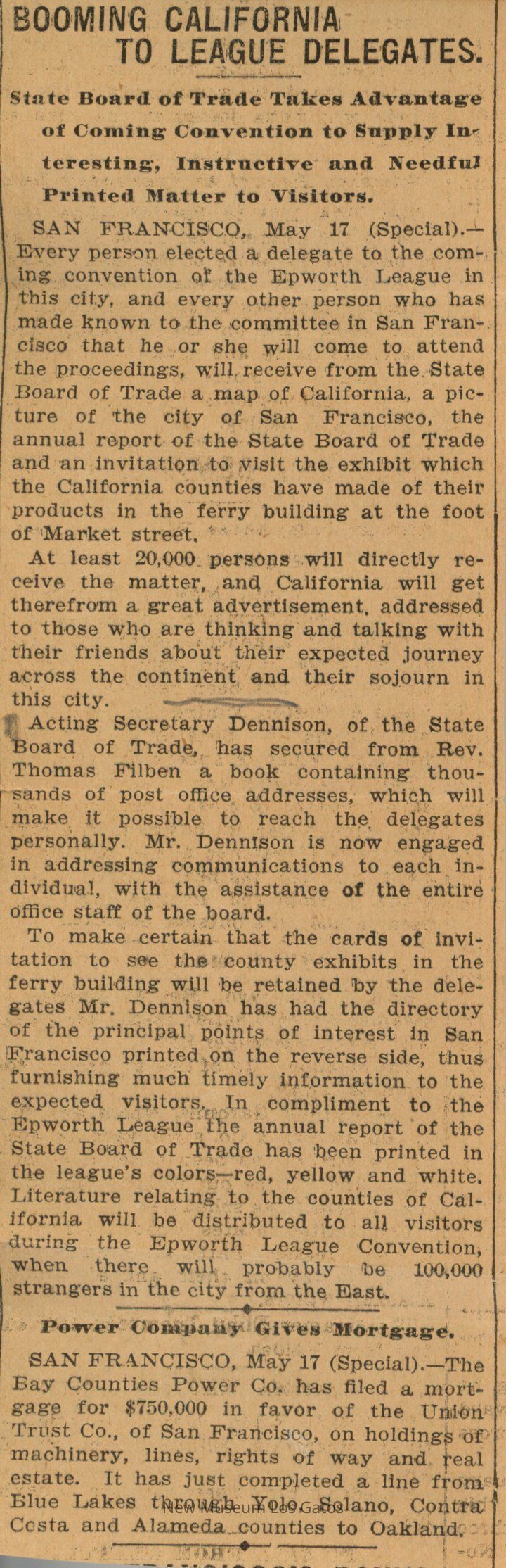 Small newspaper clipping with an attached label card. The clipped article regards a convention of Secretaries of Trade and Commercial Associations to be held in San Francisco.Collection